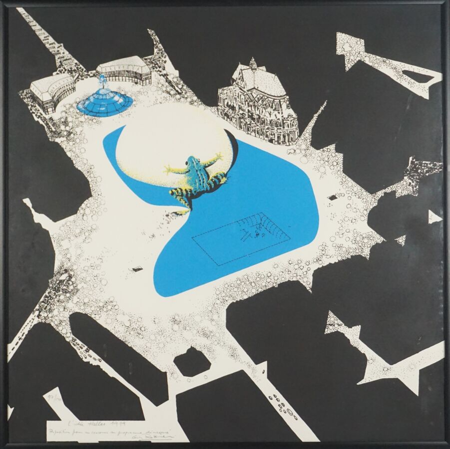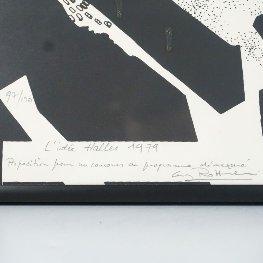 Guy ROTTIER (1922-2013), "L'idée des halles, proposition pour un concours au programme démesuré" 1979, lithographie en couleurs, signée et justifiée 97/120 en bas à gauche, 50 x 50 cm (à vue).