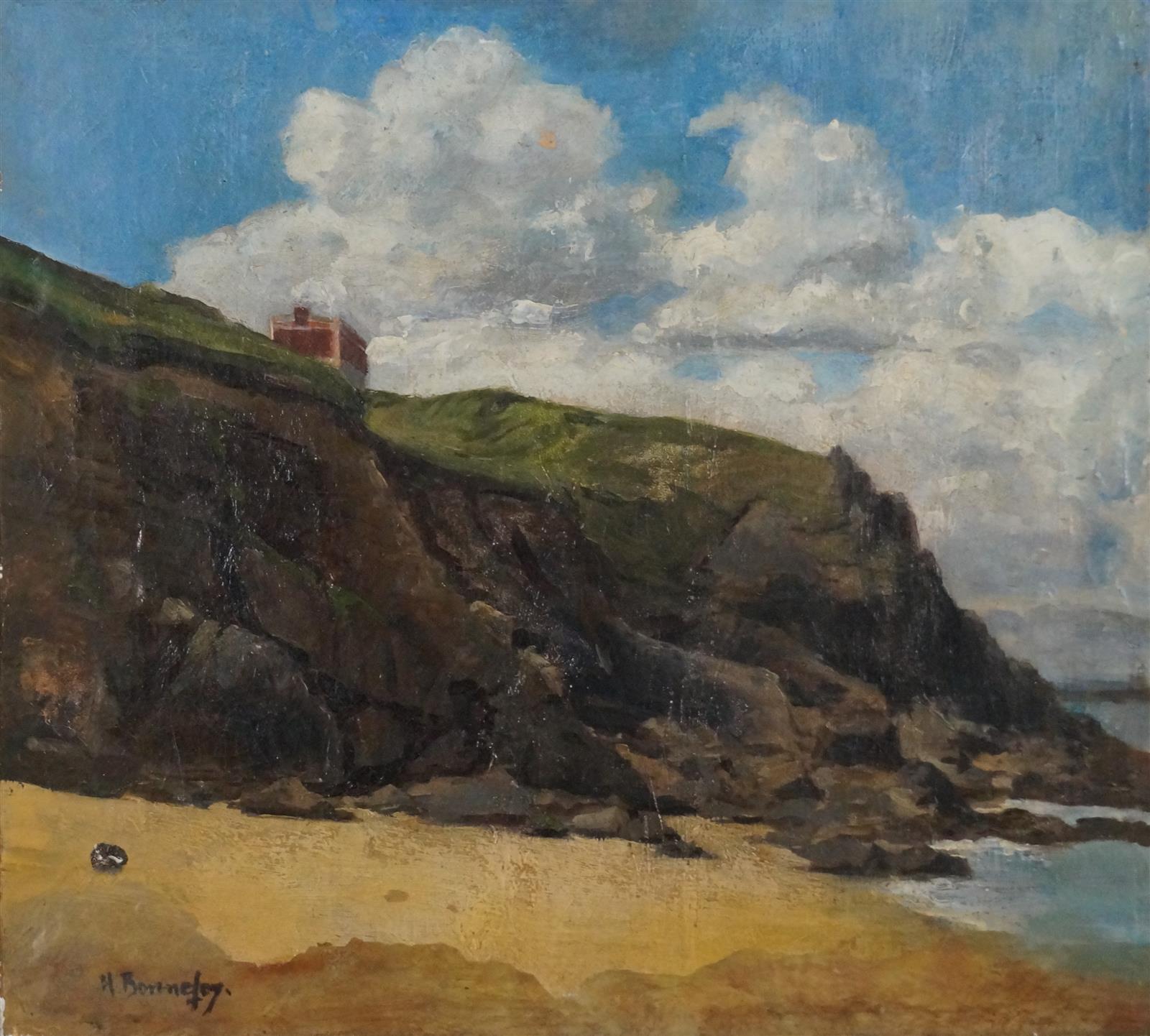 H. BONNEFOY (XXe), "Les falaises sur la plage, côte normande", huile sur toile, signée en bas à gauche, 32 x 35 cm (retouche de peinture en bas à gauche).