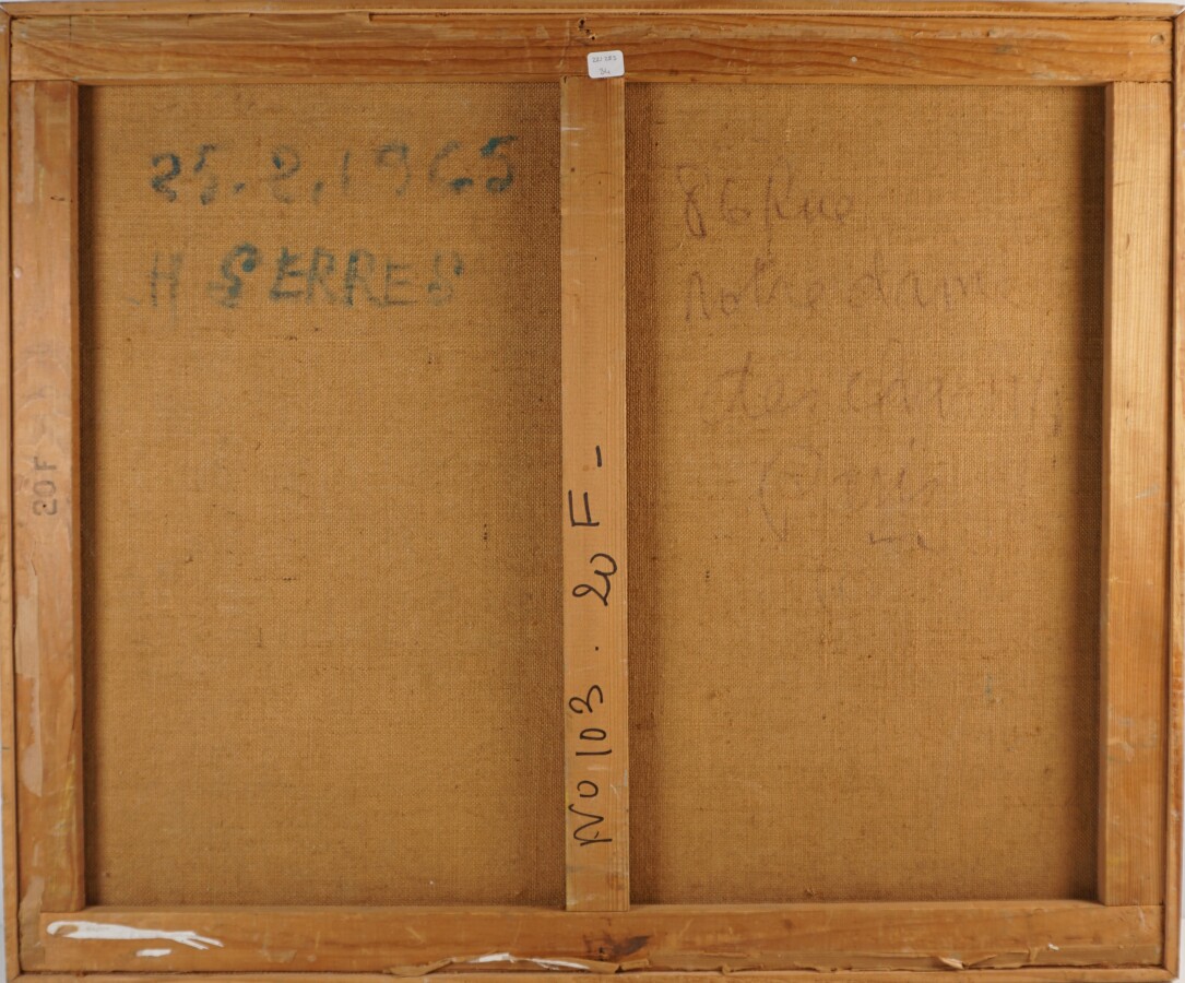H. SERRES (XXe), "Effets de vagues, mer émeraude" 25.2.1965, huile sur toile signée en bas à droite, datée et contresignée au dos, 60 x 73 cm (quelques éclats de peintures, un petit trou en bas à gauche).