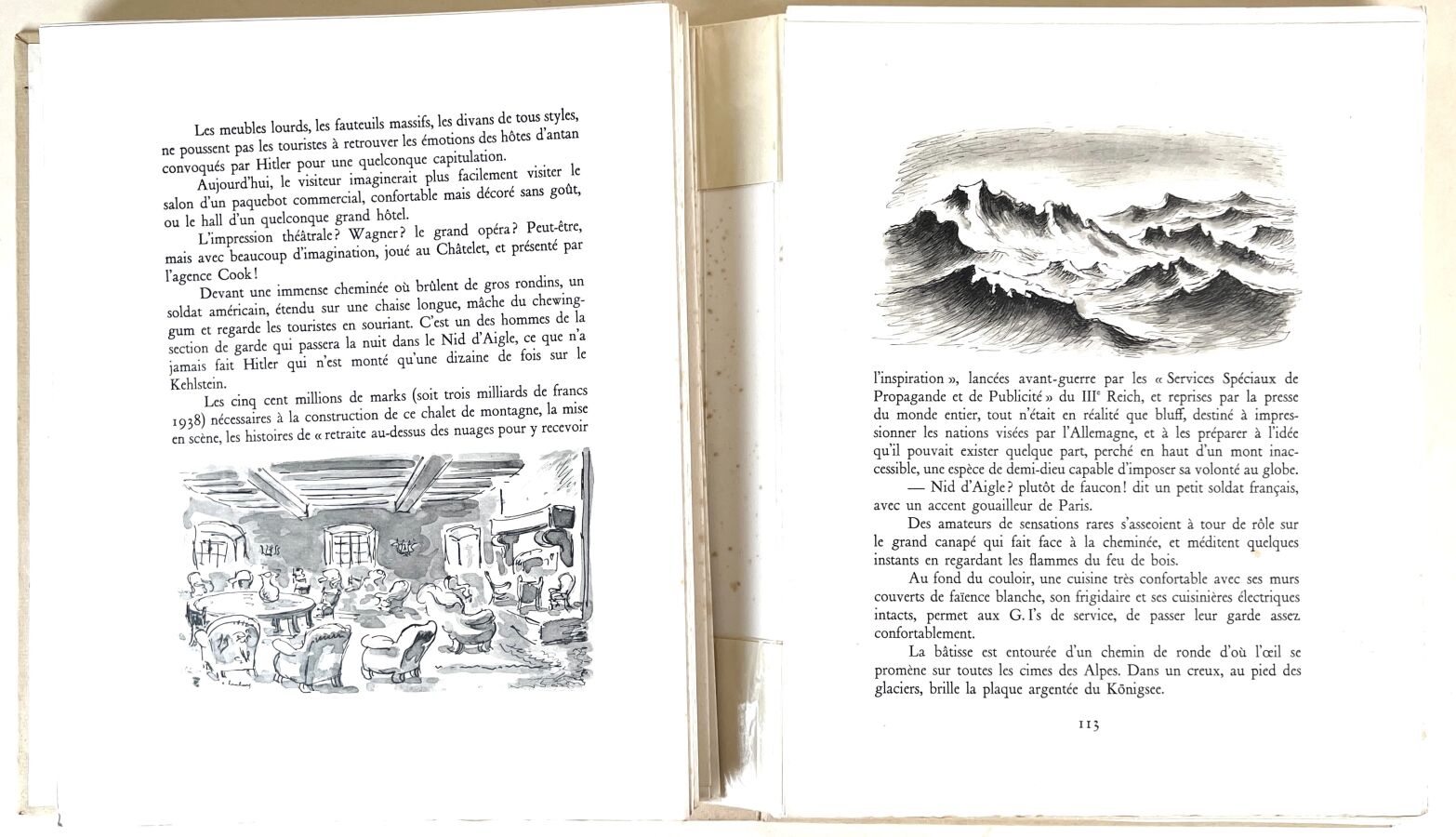 HAMBOURG (André) - Berschtesgaden-Party - Paris ; Sans nom, 1947 - 1 volume In-4° en feuilles sous couverture rempliée ornée d'1 vignette gravée au 1er plat, chemise titrée en long et emboîtage - Quelques rousseurs éparses, plus marquées en début d'ouvrage - Frontispice, vignette bleue au titre et nombreuses gravures in texte de André Hambourg - Bon exemplaire hors commerce imprimé spécialement pour Vincent Auriol (tirage total : 985) enrichi d'1 envoi autographe signé de l'auteur au faux titre : " A Monsieur Vincent Auriol, Président de la République, en souvenir d'un temps d'angoisse, d'espérance, de certitudes aussi, où grâce à l'appui du Président des journalistes d'Alger, il me fut possible de connaître un nouveau métier… et où j'ai l'émotion et la foi d'illustrer les beaux articles de " Fédor ". En toute reconnaissance et en très respectueux hommage… " - A la suite, sous le même emboîtage : DU MÊME - D'Alger à Berchtesgaden (1943-1945) - Paris ; Sans nom, 1947 - 1 volume In-4° en feuilles sous couverture rempliée ornée d'1 vignette gravée au 1er plat - 12 planches par André Hambourg dont 6 en couleurs au pochoir - Bon exemplaire, lui aussi hors commerce avec signature autographe de l'auteur à la justification (tirage total : 460).