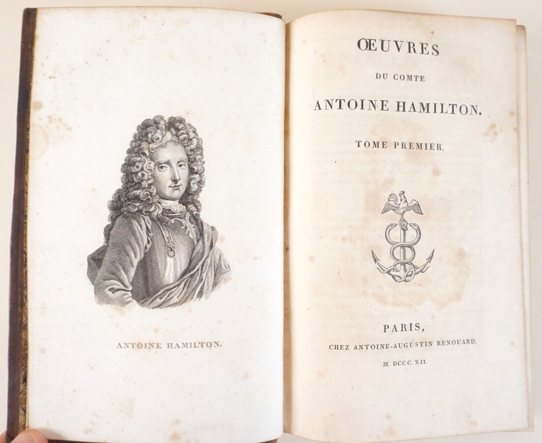 HAMILTON (Antoine, comte de) - OEuvres - Paris ; Antoine-Augustin Renouard, 1812 - 3 volumes In-8° - Quelques rousseurs éparses, quelques feuillets jaunis - Portrait frontispice, 7 portraits par Saint Aubin et 4 figures d'après Moreau, le tout gravé hors texte - Reliure de l'époque basane fauve marbrée (petites éraflures à 2 plats) - Dos lisses ornés (2 coiffes supérieures accidentées) - Pièces de titre et de tomaison maroquin bordeaux et brun - Tranches mouchetées de bleu.