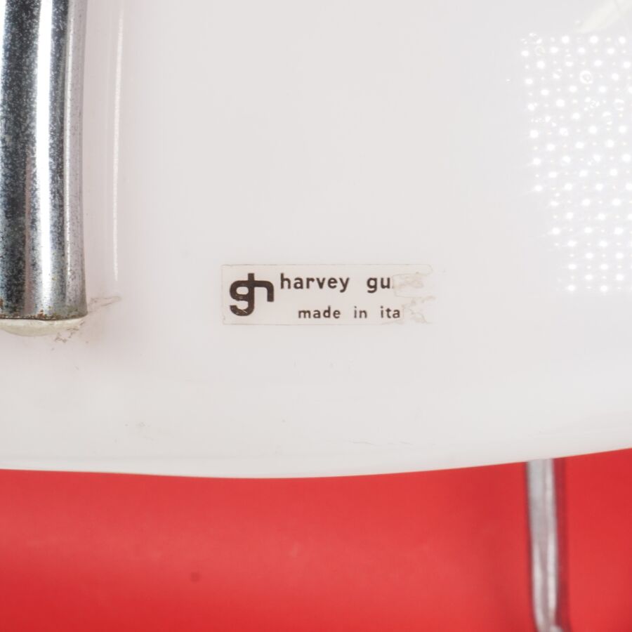 HARVEY GUZZINI : Lampe à poser, structure en acier chromé tubulaire, abat-jour demi-sphère en plastique blanc, avec son étiquette d'édition, plateau en plastique blanc, H. 40 cm (petites piqures, légère fente au plateau).