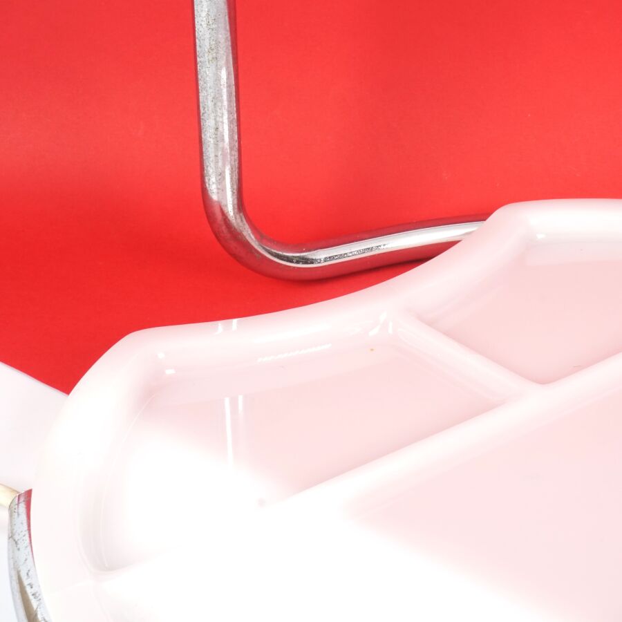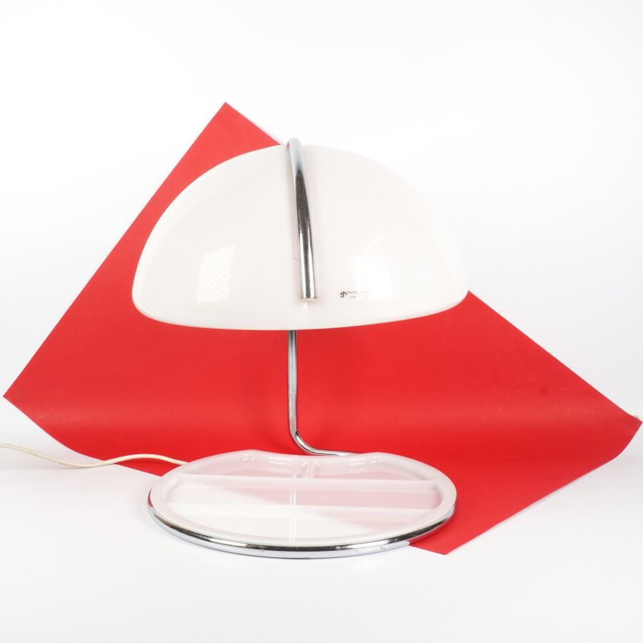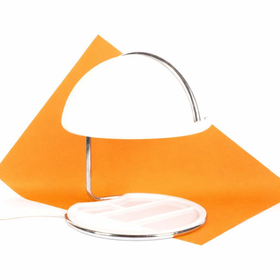 HARVEY GUZZINI : Lampe à poser, structure en acier chromé tubulaire, abat-jour demi-sphère en plastique blanc, avec son étiquette d'édition, plateau en plastique blanc, H. 40 cm (petites piqures, légère fente au plateau).