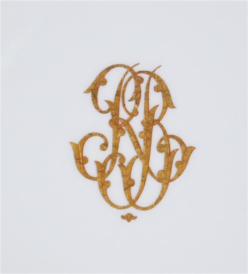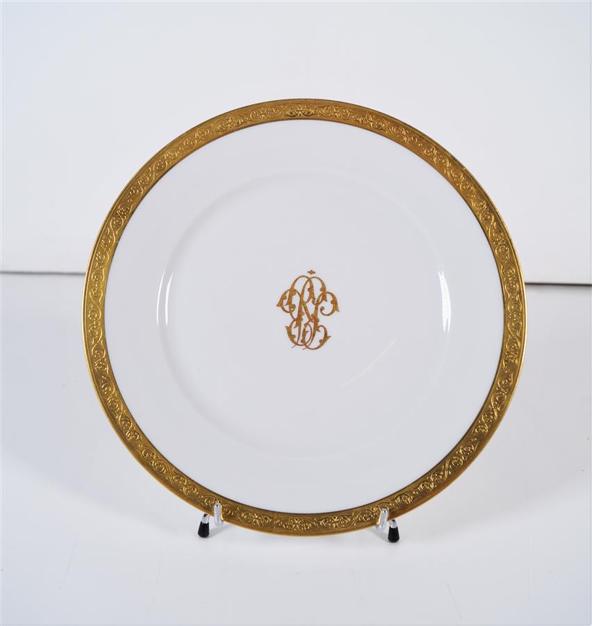 HAVILAND LIMOGES : Important service en porcelaine blanche rehaussée à l'or, à décor d'une frise de rinceaux feuillagés et d'un monogramme "RB" comprenant : 36 assiettes, 12 assiettes à dessert, 12 assiettes creuses, une soupière couverte, 2 grands plats ronds, 1 plat à tarte rond, 2 présentoirs sur piédouche, 12 assiettes à pain de forme "haricot", 1 plat ovale, 2 raviers, 1 saucière, 1 saladier, 1 plat à mignardises à deux anses, 7 tasses, 12 sous-tasses, 1 pot à lait, 1 verseuse et 1 sucrier (un plat accidenté, petites usures). On joint d'un modèle similaire signé Limoges France : 1 saucière, 1 légumier rond, 1 plat rond, 1 plat ovale et un plat creux rond.