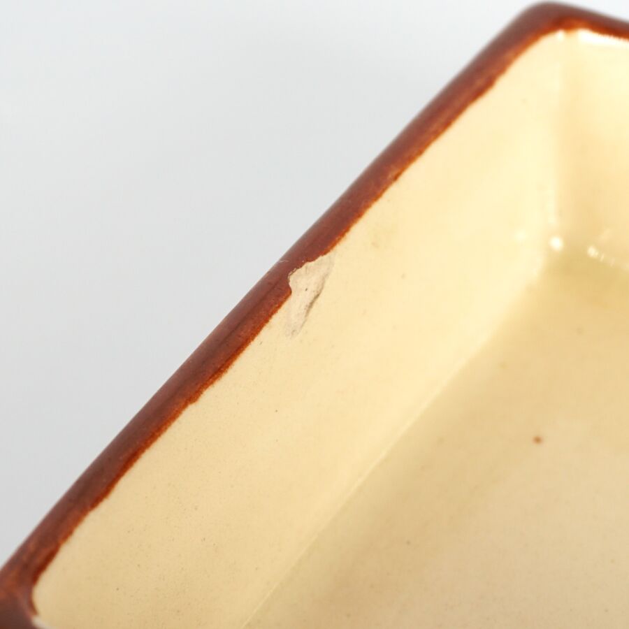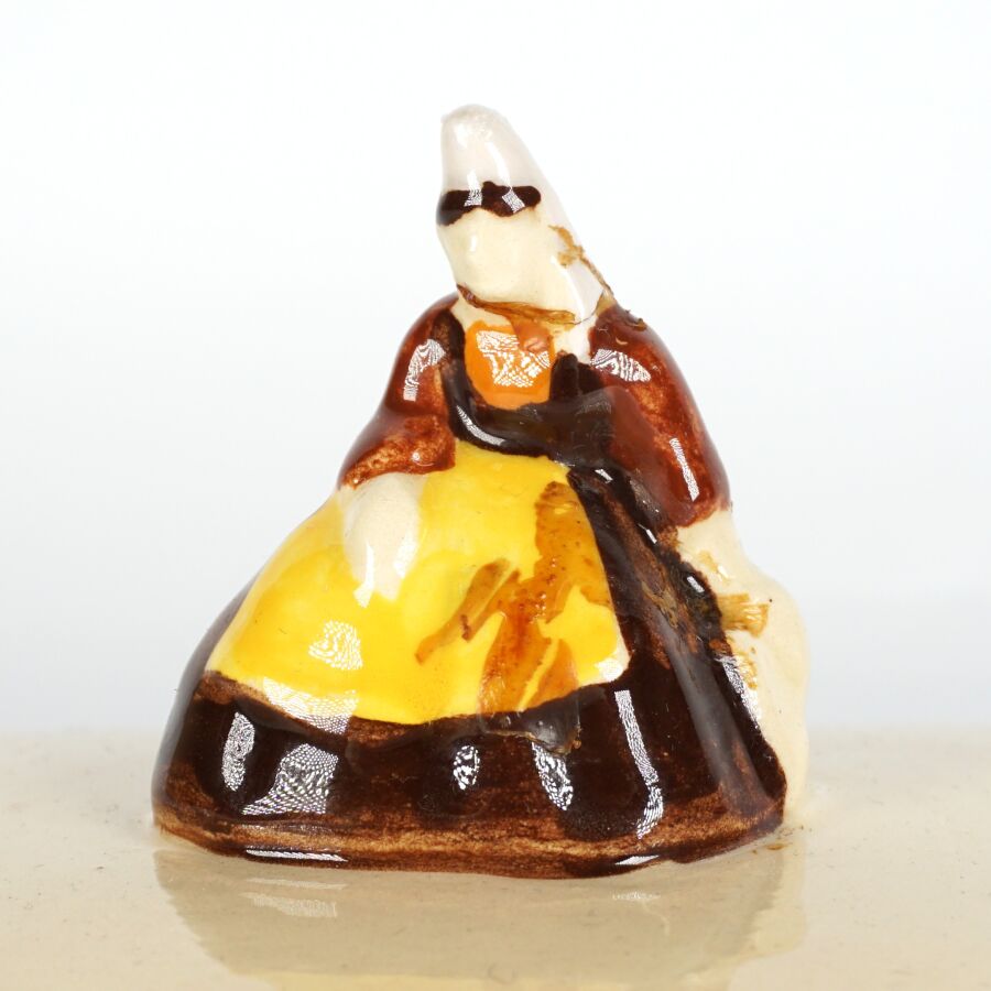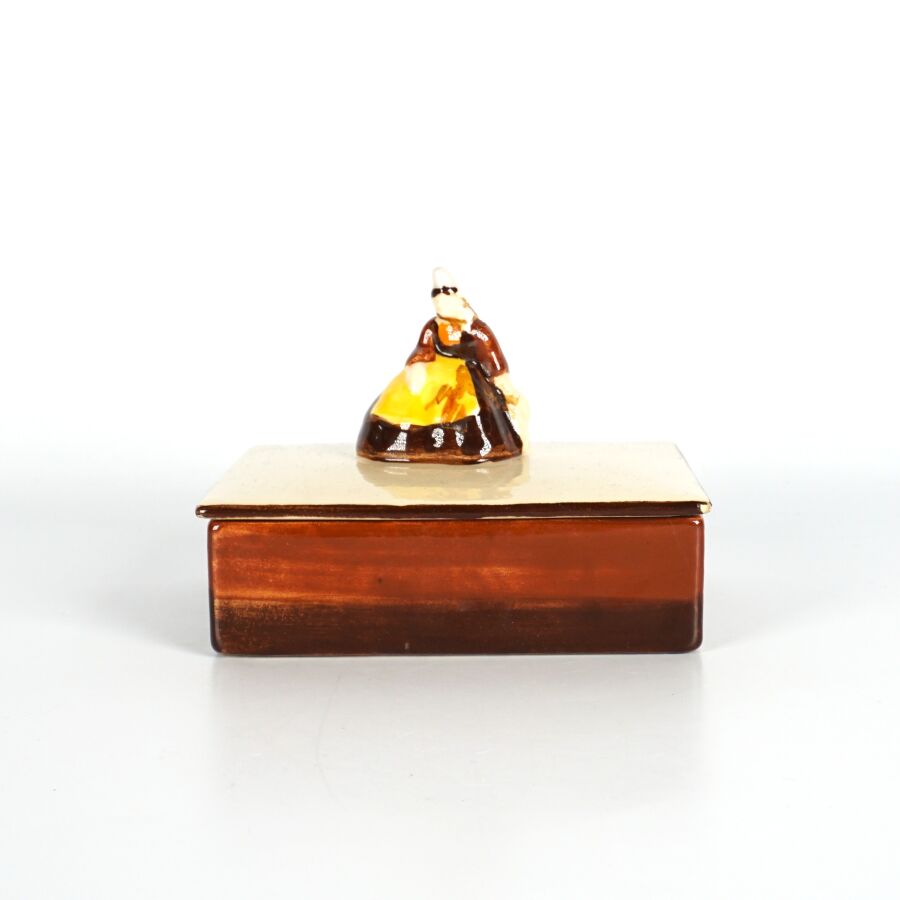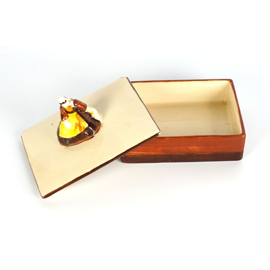 HB QUIMPER : Boîte rectangulaire en faïence émaillée polychrome, le couvercle orné d'une bigoudène, signée dessous, L. 12.3 cm (éclats).