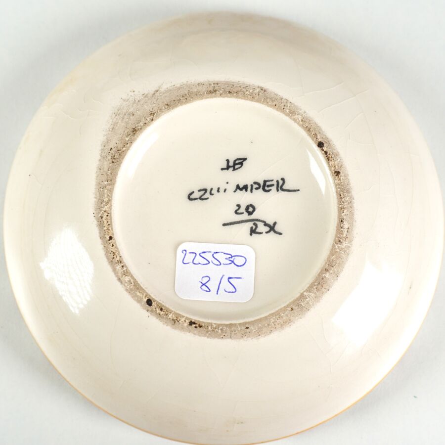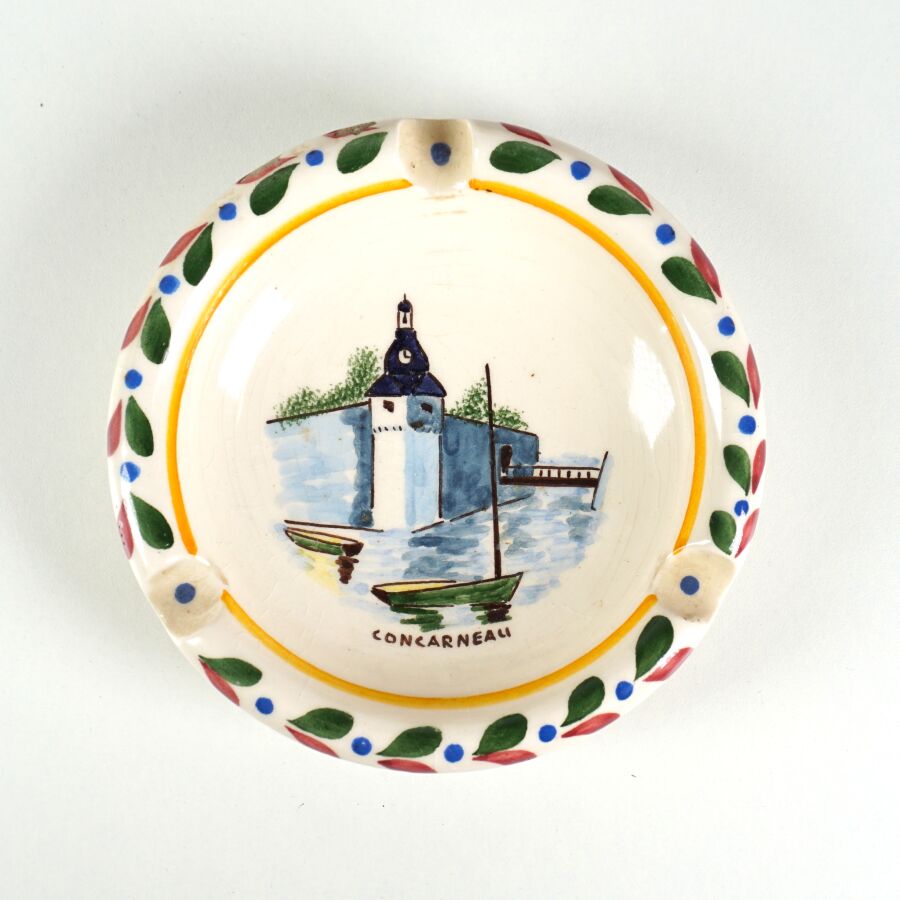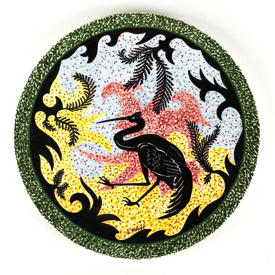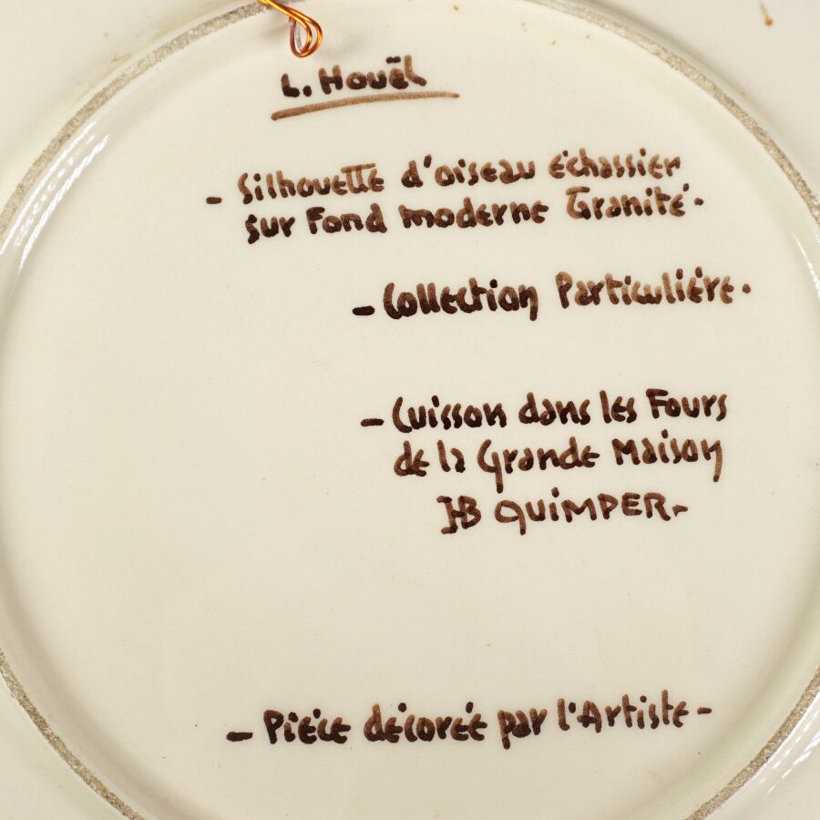 HB QUIMPER : Ensemble en faïence comprenant un cendrier à décor d'un paysage de Concarneau et une assiette signée L. HOUËL représentant la silhouette d'un oiseau échassier sur fond granité, D. Cendrier : 13.5 cm. D. Assiette : 24.2 cm.
