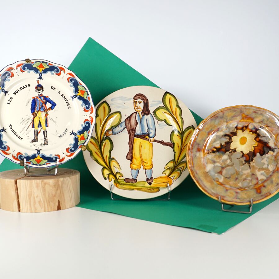 On y joint trois assiettes décoratives en faïence émaillée polychrome, D. De la plus grande : 29 cm.