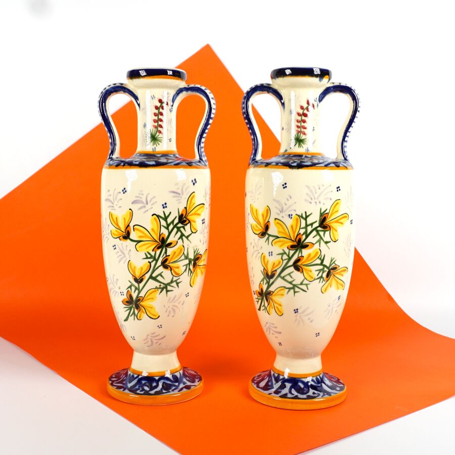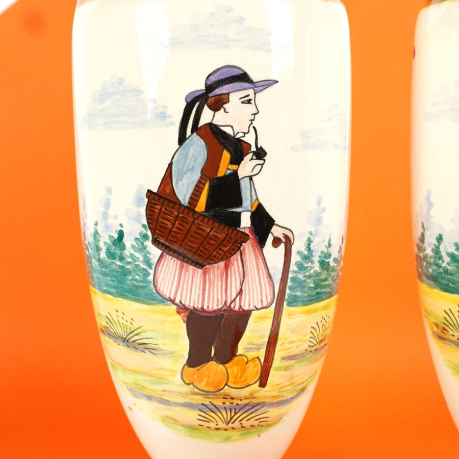 HB QUIMPER : Paire de vases de forme amphore en faïence émaillée polychrome à décor d'un couple de bretons et de jeunets, signés dessous, circa 1930, H. 34 cm.