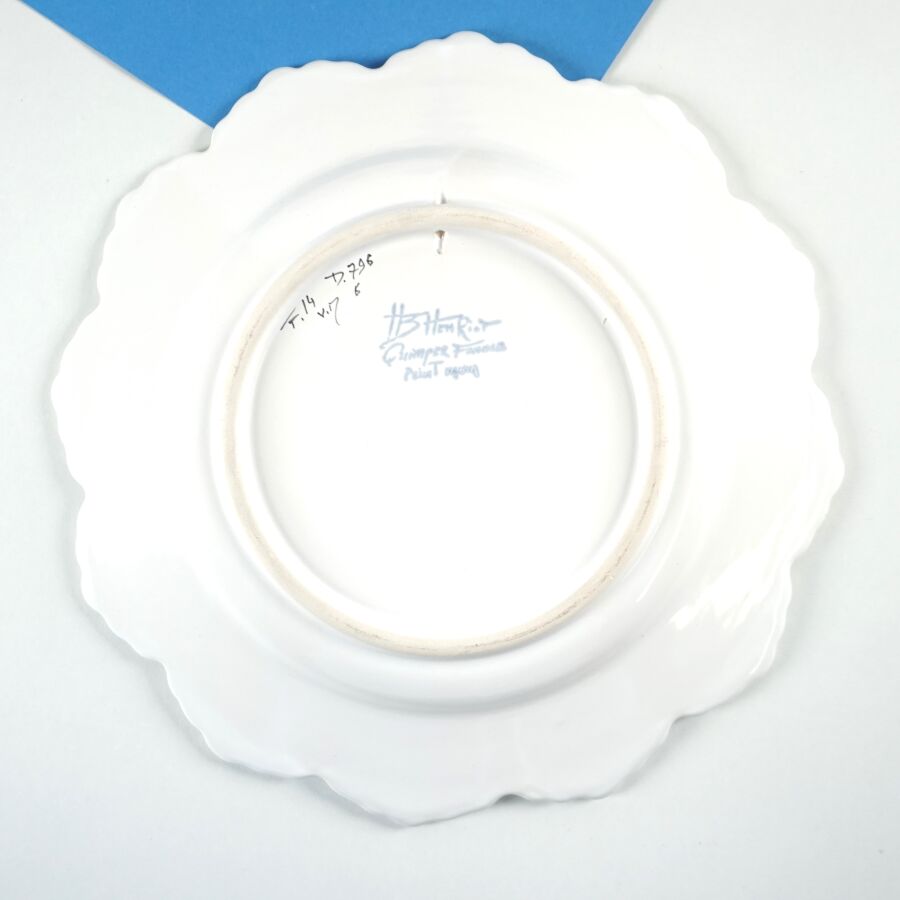 HB QUIMPER : Suite de six assiettes floriformes, faïence émaillée polychrome à décor de bretons, marquées dessous, L. 26 cm.