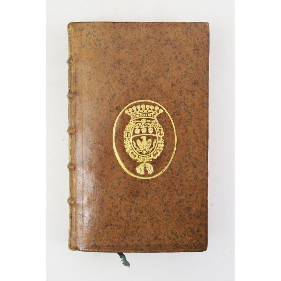 Précieux exemplaire en veau d'époque aux armes de Charles-Jean-Baptiste FLEURIAU D'ARMENONVILLE (1686-1732), comte de Morville, seigneur d'Armenonville. Il fut successivement reçu avocat du Roi au Châtelet le 19 août 1706, conseiller au parlement de Paris et procureur au grand conseil le 14 mars 1711. Ambassadeur en Hollande en janvier 1718, il obtint, sur la démission de son père, la charge de secrétaire et grand-croix de l'ordre de Saint-Louis, le 24 avril 1719, le portefeuille de secrétaire d'État au département de la marine, le 9 avril 1722, et fut reçu conseiller d'État le 11 du même mois ; il entra à l'Académie française le 22 juin 1723, quitta la marine pour devenir ministre des affaires étrangères le 10 août 1723, fut créé chevalier de la Toison d'Or le 22 octobre 1724 et fut nommé protecteur de l'Académie des sciences et des arts de Bordeaux en octobre 1726 ; il se démit de ses charges de secrétaire d'État et de secrétaire et grand-croix de Saint-Louis le 19 août 1727 et devint à la mort de son père en novembre 1728, bailli et gouverneur de Chartres. (O.H.R. 1485, fer n°3.) Qqs usures mineures.
