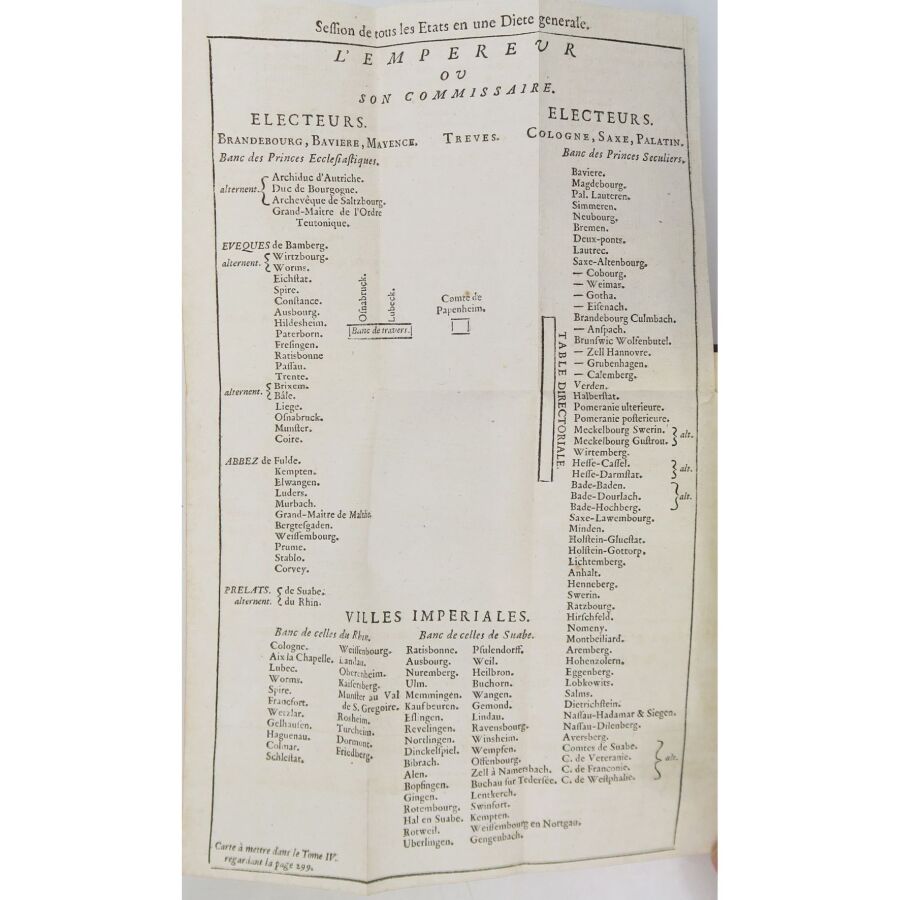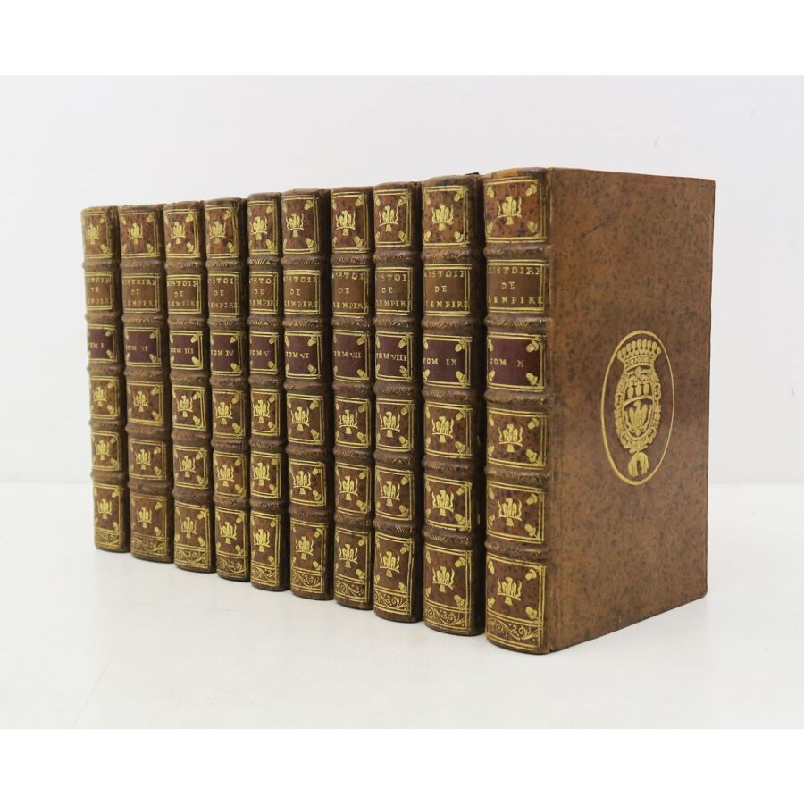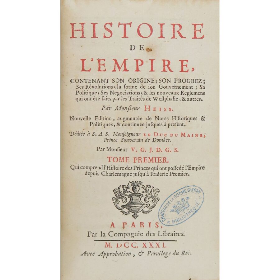 HEISS VON KOGENHEIM (Johann). Histoire de l'Empire, contenant son origine ; son progrez ; ses révolutions ; la forme de son gouvernement ; sa politique ; ses negociations ; & les nouveaux reglemens qui ont été faits par les traités de Wesphalies, & autres. Paris, Cie des Libraires, 1731. 8 tomes reliés en 10 volumes in-12, veau marbré, dos à nerfs richement ornés, armes dorées au centre des plats, roulette dorée sur les coupes et intérieure (reliure de l'époque).