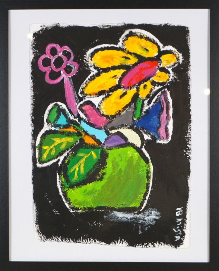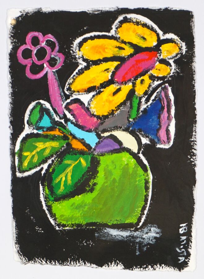 Helder BATISTA (1964), "Purple Flower", acrylique sur papier Arches signée en bas à droite, 50 x 40 cm.