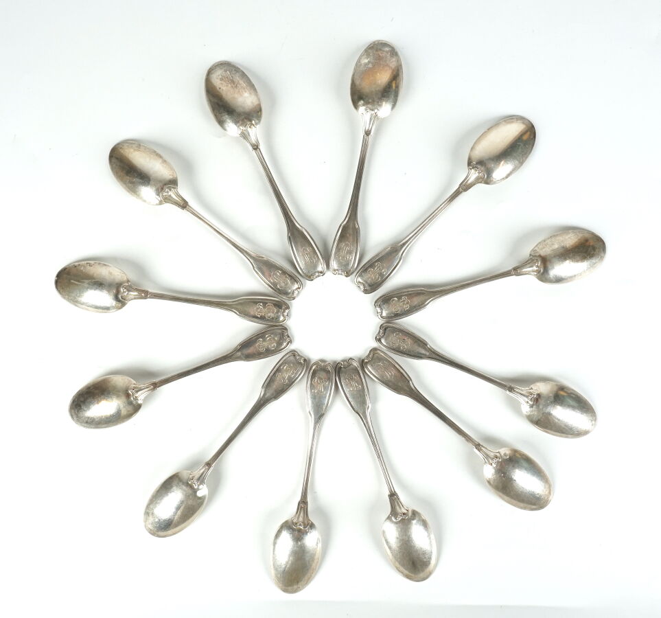 HENIN & Cie : Ensemble de 12 petites cuillères en argent, poinçon Minerve 1er titre, modèle filet et coquille, monogrammé, L. 12 cm. Poids brut : 210 g environ.