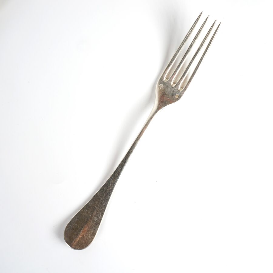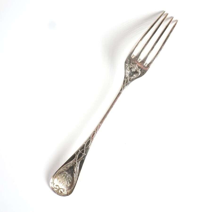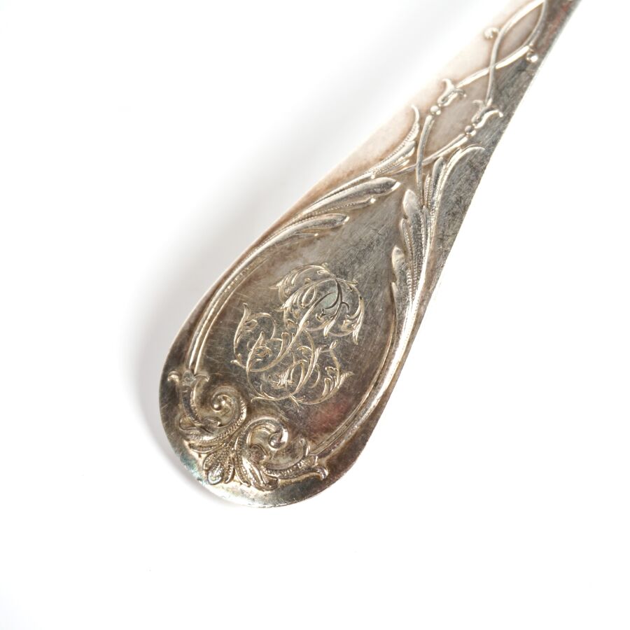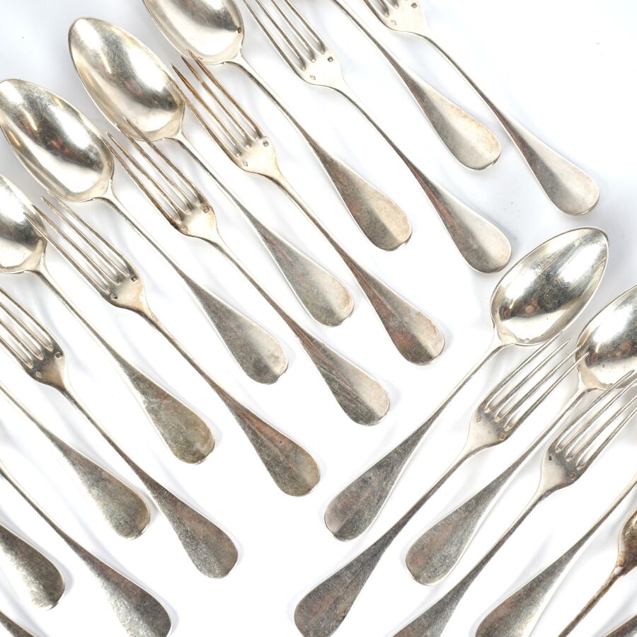 HENIN & CIE : Suite de 12 couverts en argent, poinçon Minerve 1er titre (950/oo), à décor uniplat, le revers du manche à décor gravé d'un chiffre encadré de végétaux, Poids brut : 1 195 g environ.