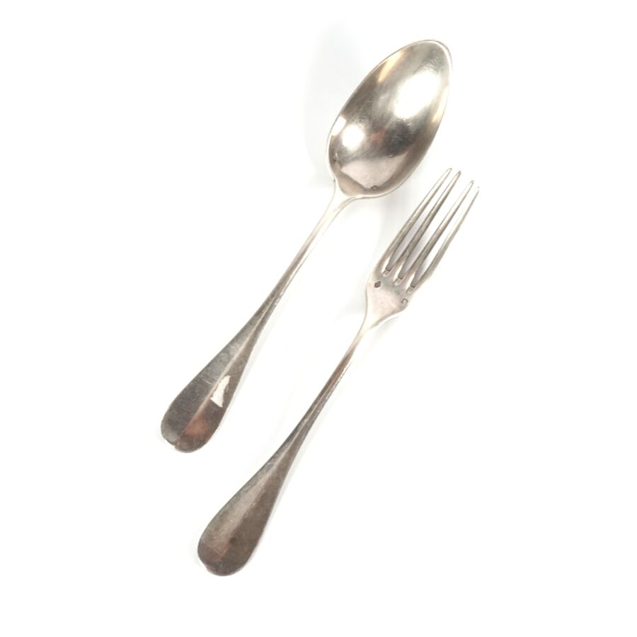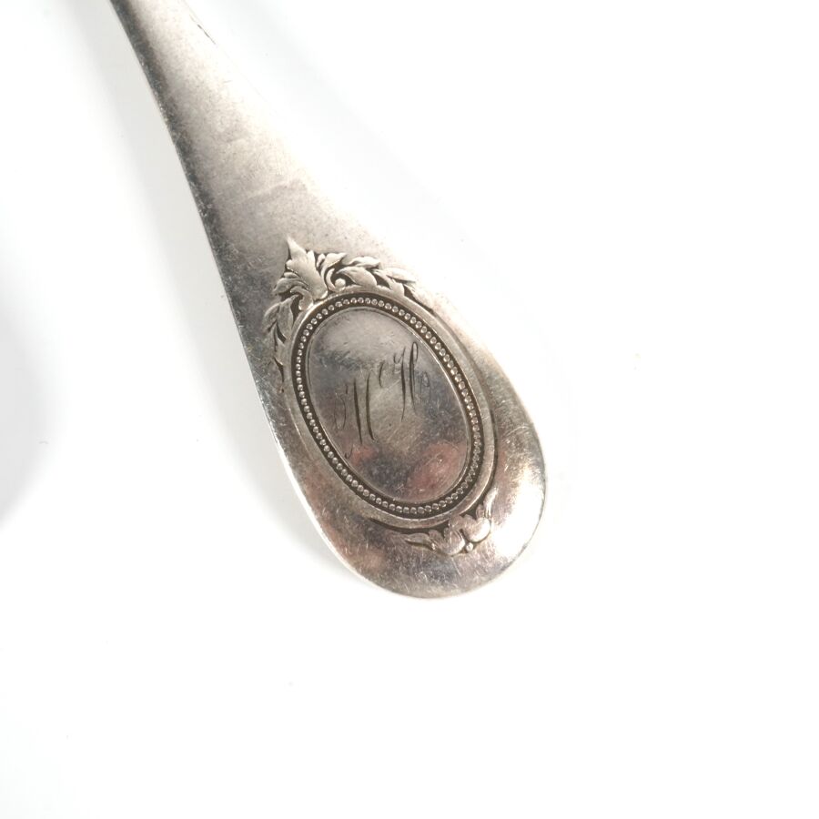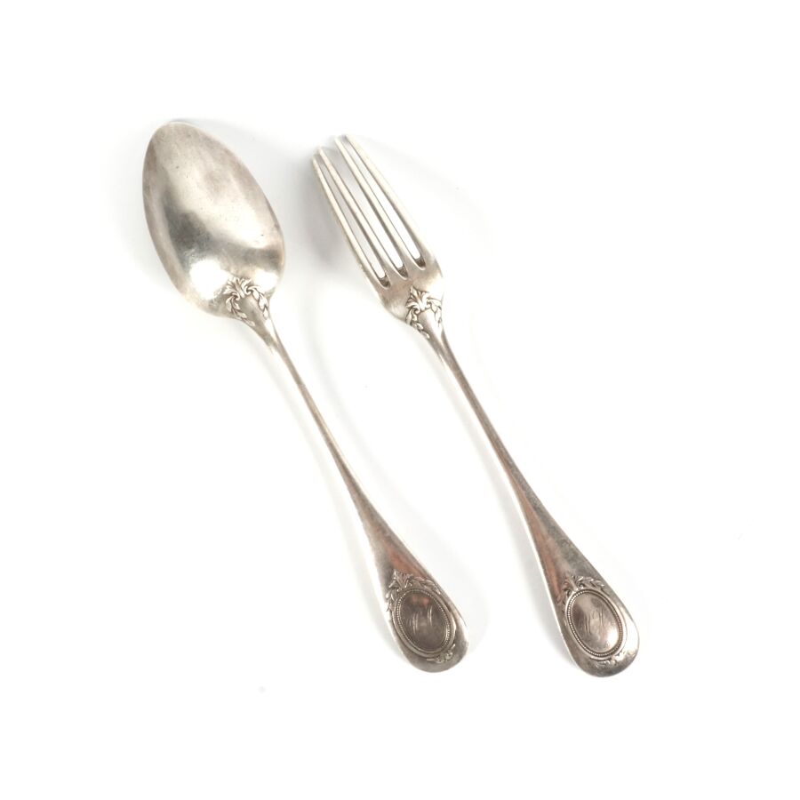 HENNIN & CIE : Couvert en argent, poinçon Minerve 1er titre, décor uniplat, le revers à décor végétal, orné du chiffre "MH" gravé dans un blason ovale, Poids brut : 121 g environ.