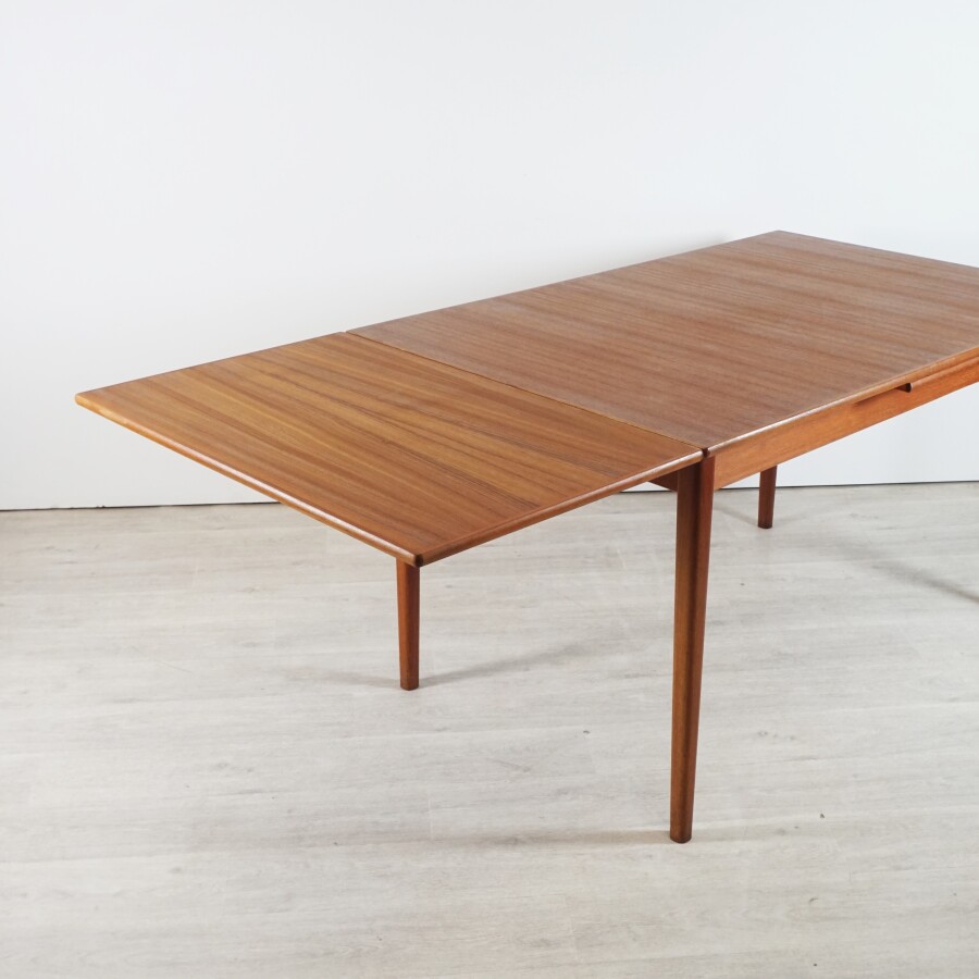 Henning KJÆRNULF (XX-XXIe) : Table de salle à manger, teck, avec ses allonges, circa 1964, Danemark, H. 73 cm. L. Sans allonges : 130 cm. L. Avec allonges : 238 cm (légères rayures aux pieds, plateau en bel état).