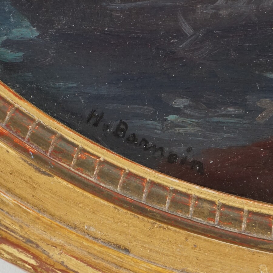 Henri Alphonse BARNOIN (1882-1940), "Départ pour la pêche" et "Retour de pêche au crépuscule", deux huiles sur panneaux format ovale, la première signée en bas à gauche et la seconde signée en bas à droite, 16 x 23.5 cm (un petit manque à l'un des cadres).