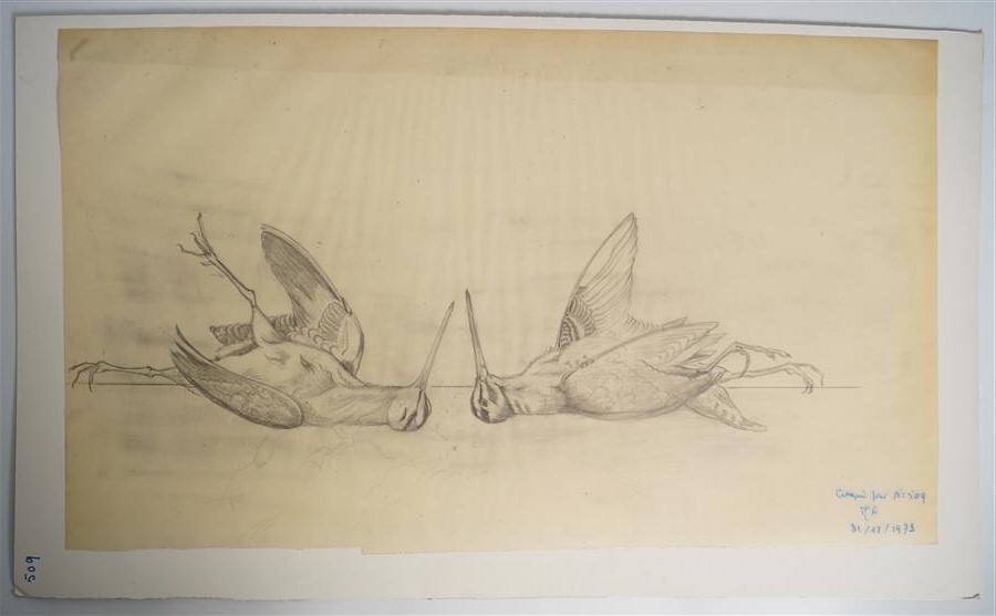 Henri DE LINARES (1904-1987), "Deux bécasses, croquis pour N° 509" 31.12.1973, dessin au crayon sur calque, monogrammé, annoté et daté en bas à droite, 30 x 52 cm