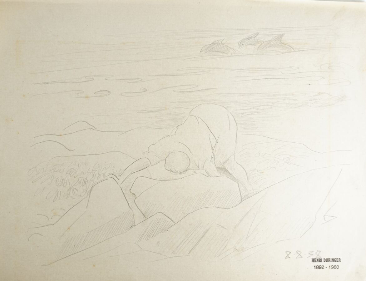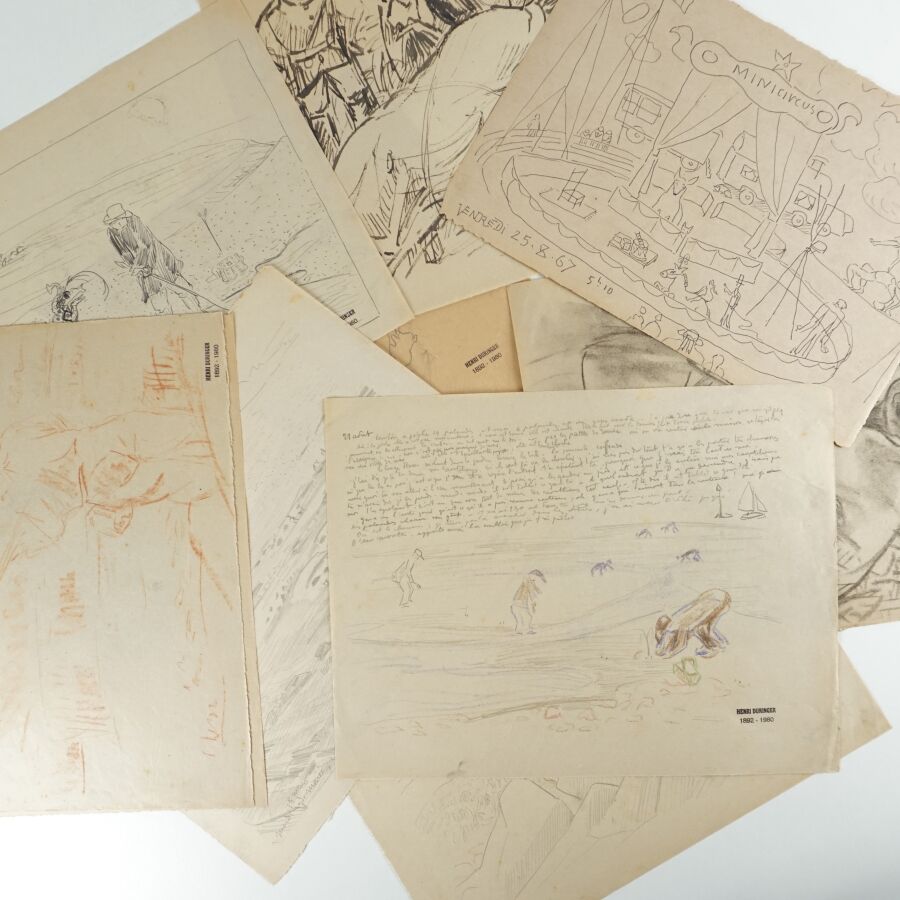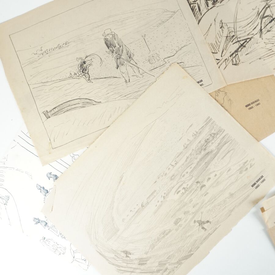 Henri DURINGER (1892-1980), Ensemble de onze dessins au crayon sur papier figurant des scènes de personnages animées, scènes de rue et de cirque, chacune signées du tampon de l'artiste, certaines datées et titrées, Dim. 21 x 30.5 cm à 26.2 x 37.5 cm (quelques traces et pliures).
