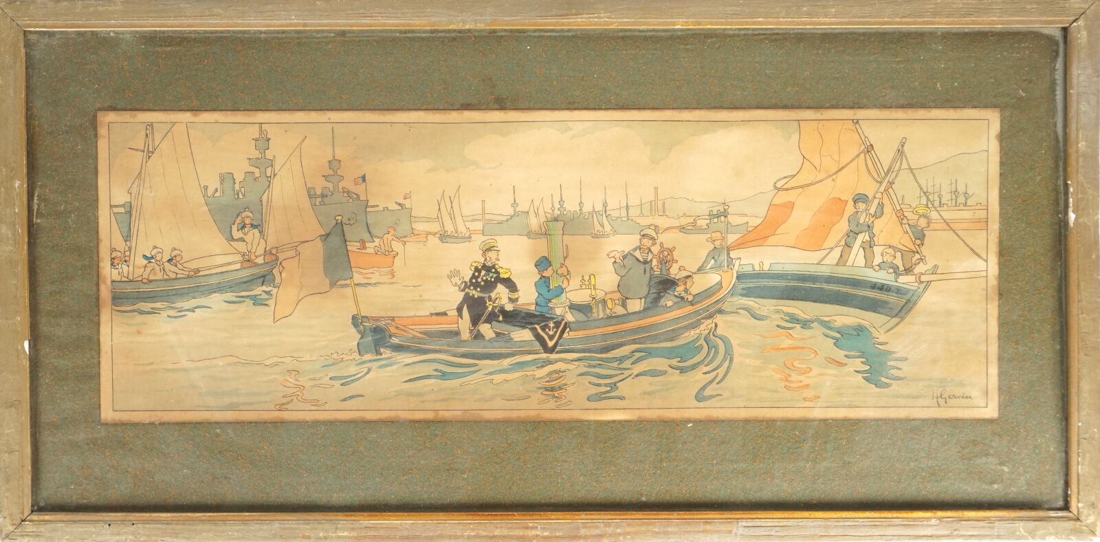 Henri GERVESE (1880-1959), paire de lithographies représentant "la revue" et "à l'abordage", signée en bas à droite, 15 x 42 cm.