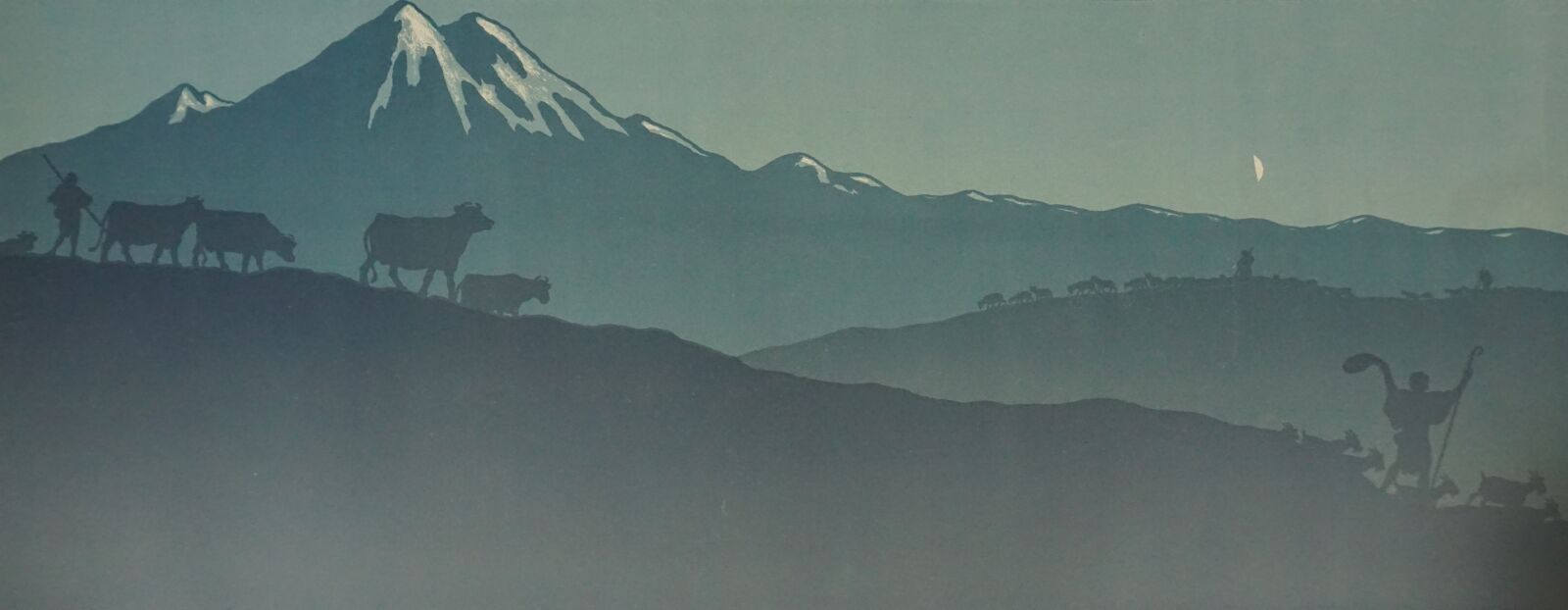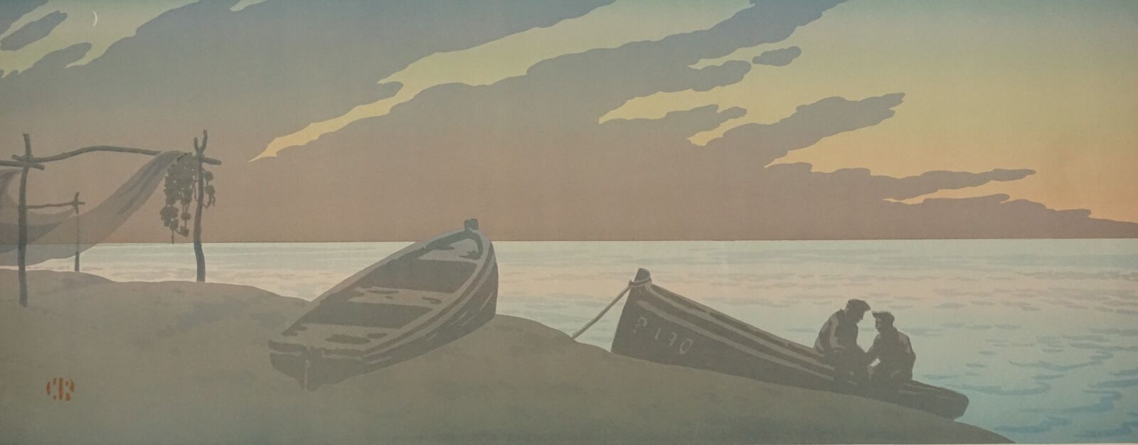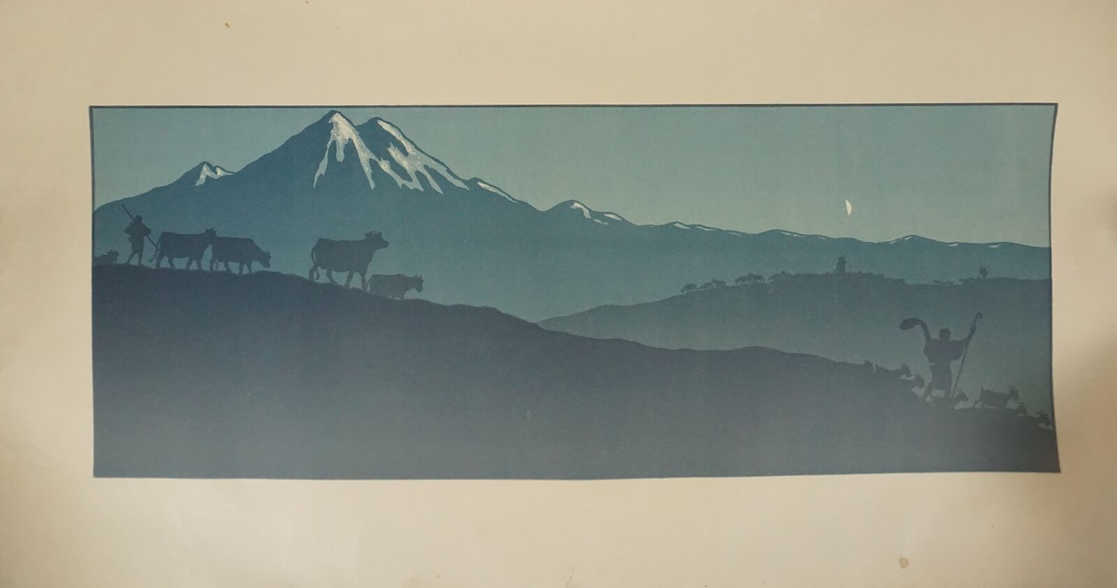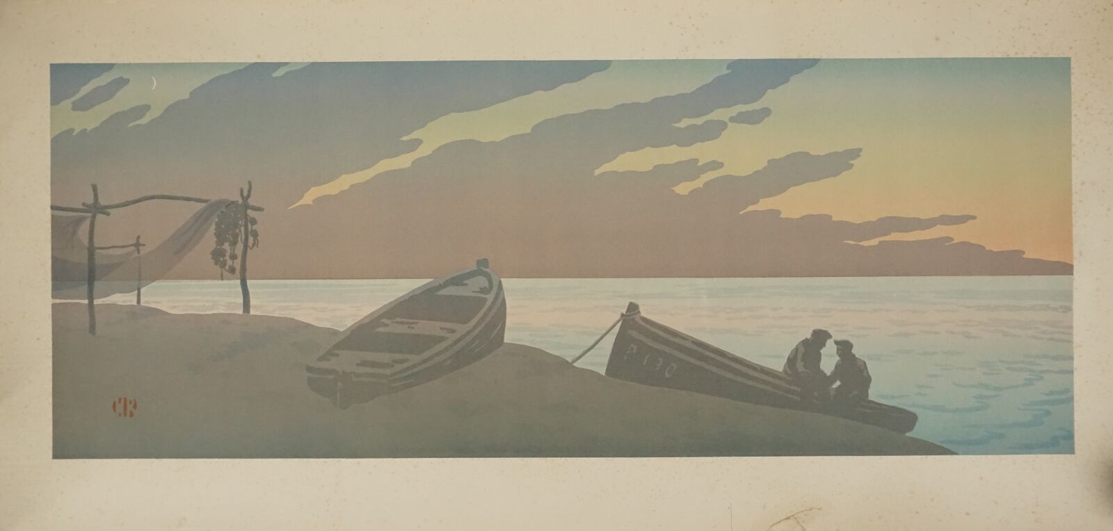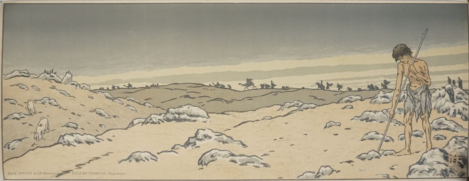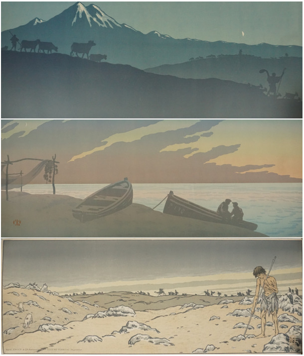 Henri RIVIERE (1864-1951), "Vaches d'alpage en montagne", "Le séchage des filets" - De la série féérie des heures et "Le juif errant", suite de trois estampes, l'une émargée, Dim. 23.3 x 60.3 cm et 23 x 60.5 cm environ (petites taches, léger manque à l'une et déchirures en marge).