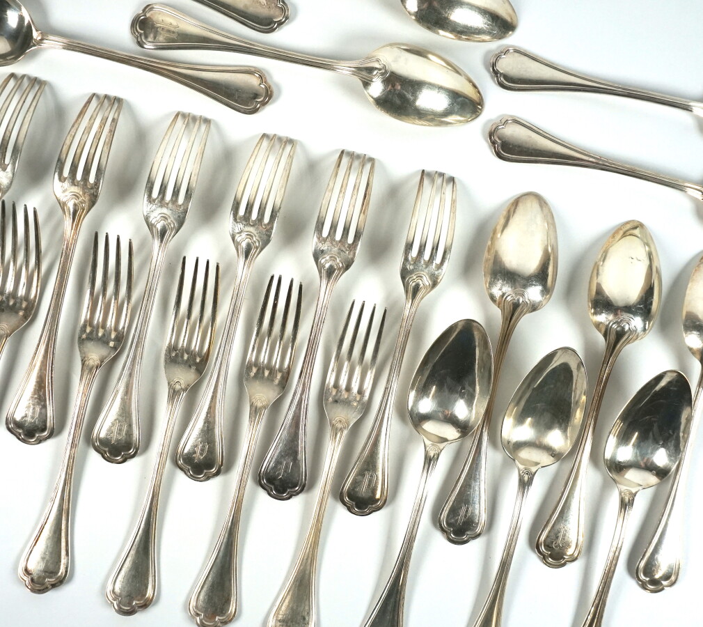 Henri SOUFFLOT : 12 grands couverts en argent, poinçon Minerve 1er titre, modèle filet, le manche à décor gravé d'un "P", L. 21 cm environ. Poids brut : 1 860 g environ.