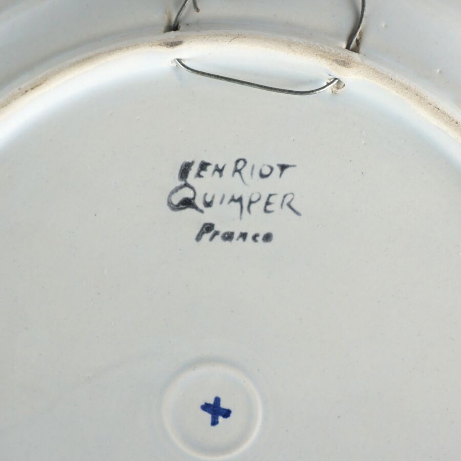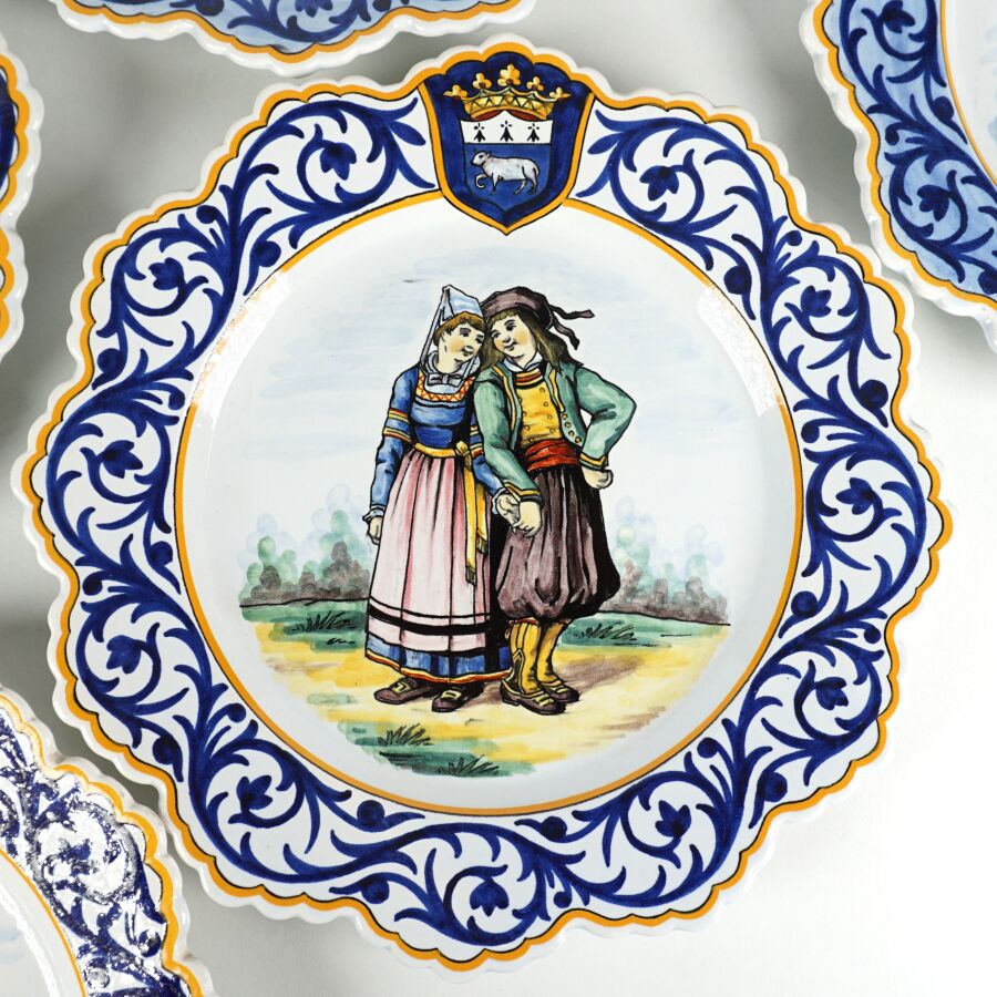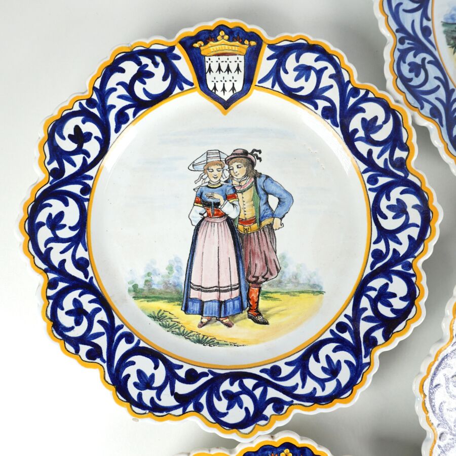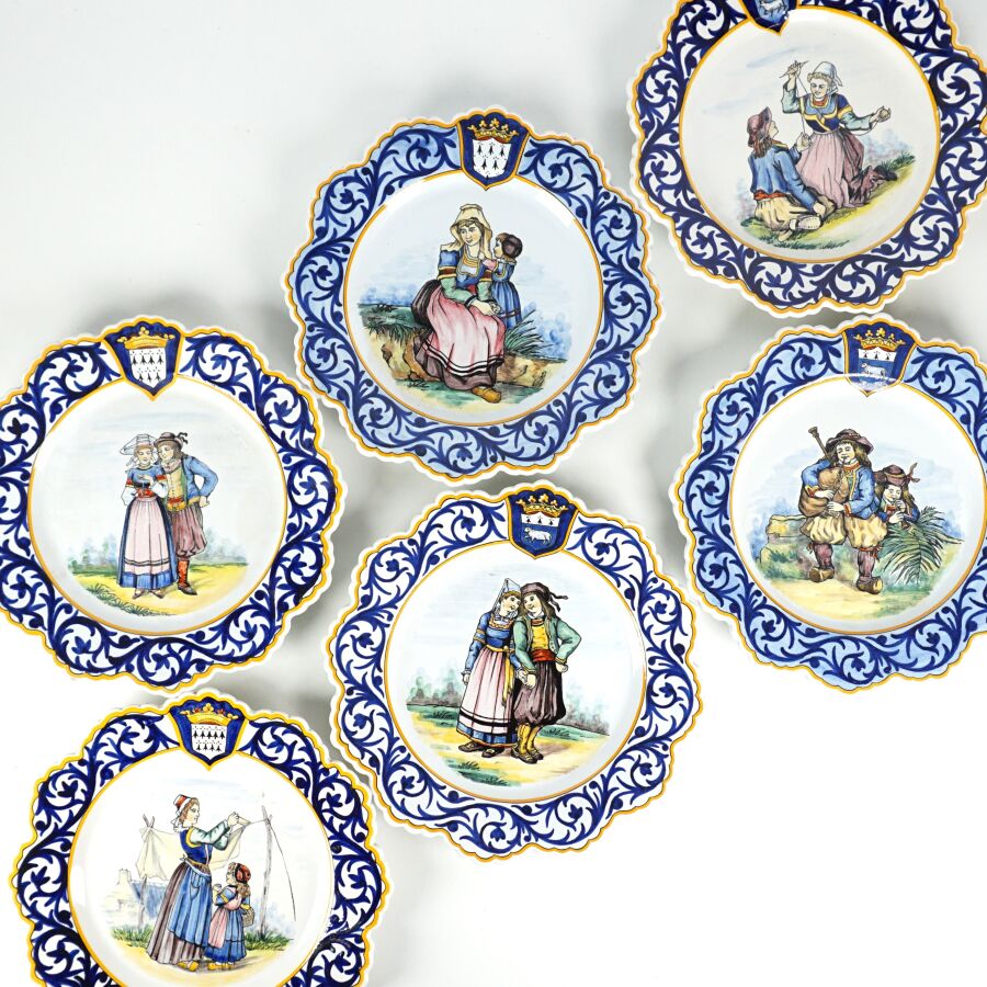 HENRIOT à QUIMPER : Ensemble de 6 assiettes en faïence émaillée polychrome à décor de scènes bretonnes sommées des armes de Quimper et autres villes bretonnes, seconde moitié du 19ème siècle, D. 26 cm.
