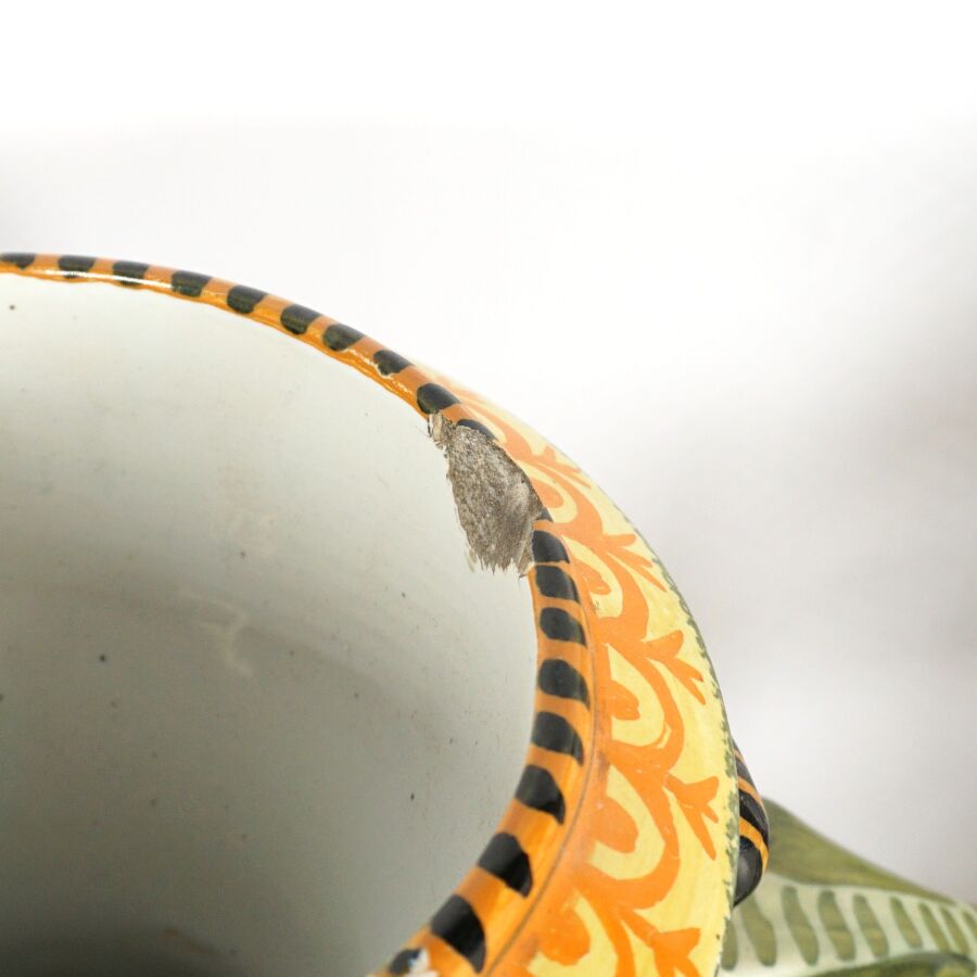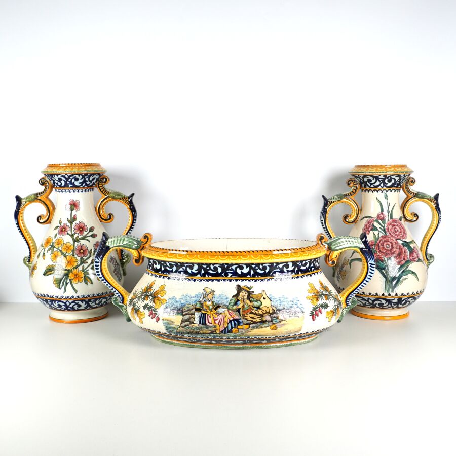 HENRIOT à QUIMPER : Garniture de cheminée en faïence émaillée polychrome à décor de scènes bretonnes, bouquets de fleurs et armes de Bretagne comprenant une jardinière et une paire de vases, vers 1920, H. Vase : 32 cm. L. Jardinière : 52 cm (fêle de cuisson sur la jardinière, éclat au col de l'un des vase).