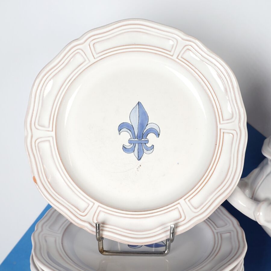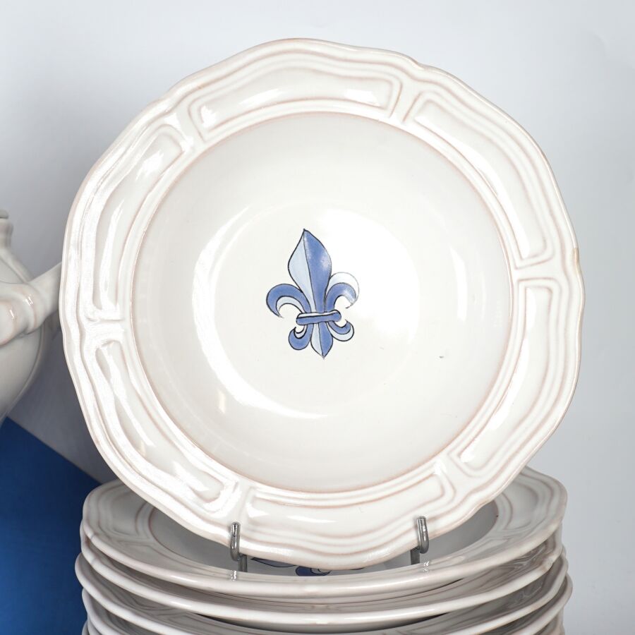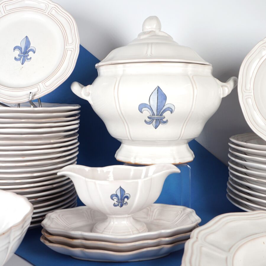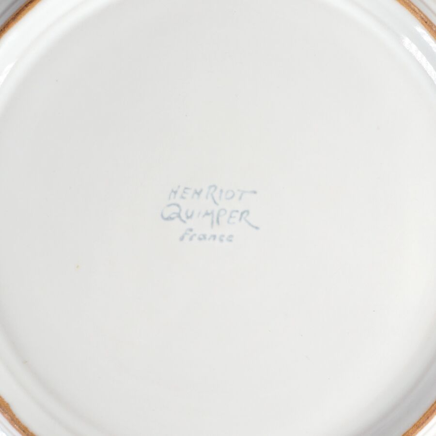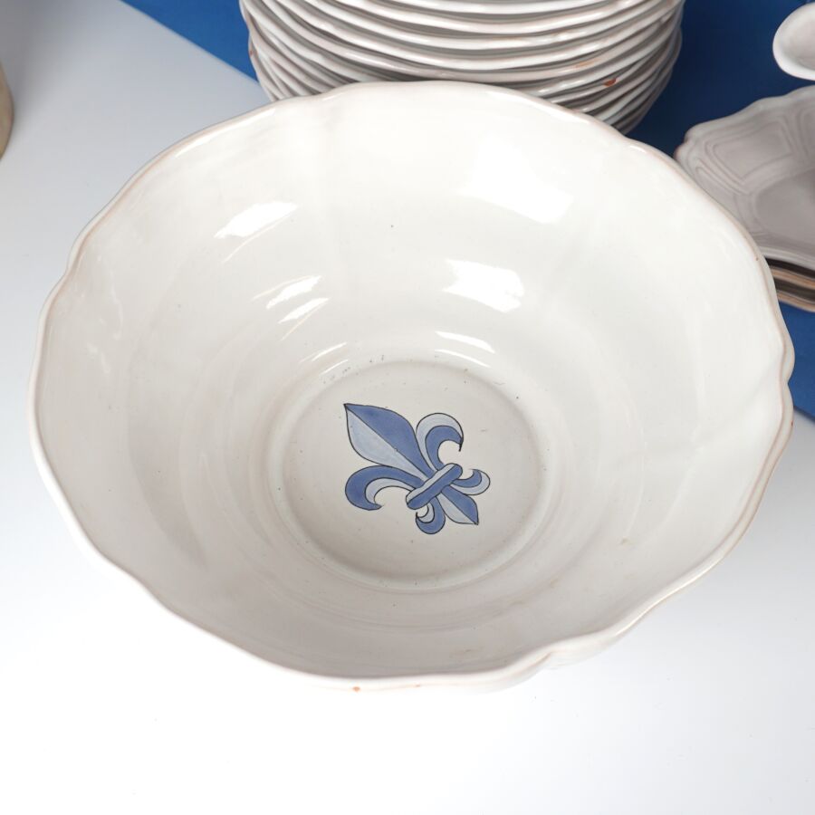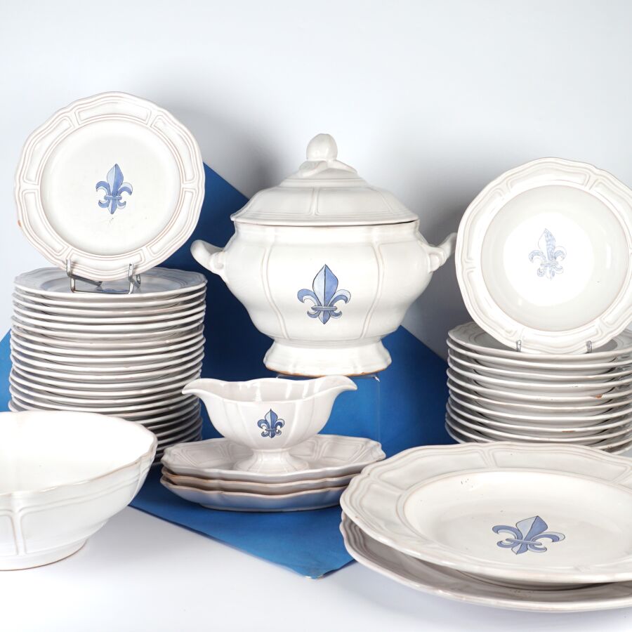 HENRIOT à QUIMPER : Partie de service en faïence émaillée à décor d'une fleur de lys comprenant 1 soupière, 1 jatte, 1 saucière, 2 raviers, 2 grands plats ronds, 24 assiettes plates et 12 assiettes creuses, marqués dessous, circa 1950, D. Assiette creuses : 23 cm. H. Soupière : 27.5 cm. D. Assiette plate : 22 cm (éclats).