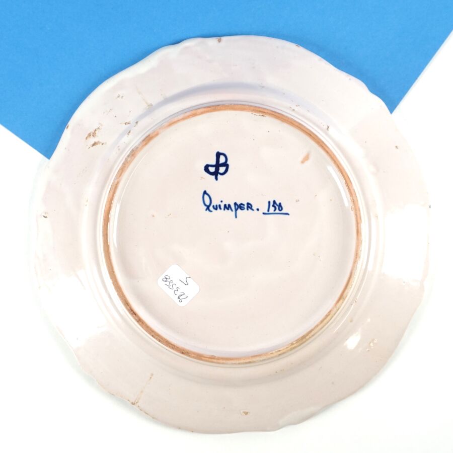 HENRIOT QUIMPER : Assiette à bord chantourné en faïence émaillée polychrome à décor de légende bretonne "Yan-Coz chez le diable", marquée PB au dos, circa 1920, Diam. 24 cm.