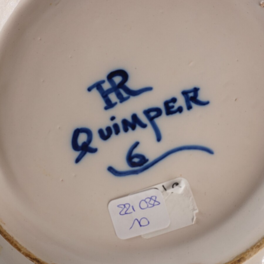HENRIOT QUIMPER : Beurrier en faïence émaillée polychrome, à décor de noeuds, fleurs et d'un biniou, le couvercle orné d'une scène d'un musicien assis, marqué au dos, H. 38.5 cm (sauts d'émail et infimes éclats).