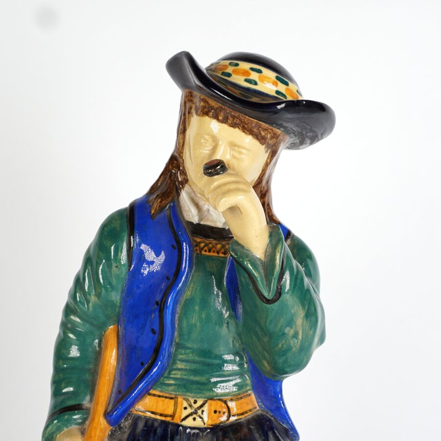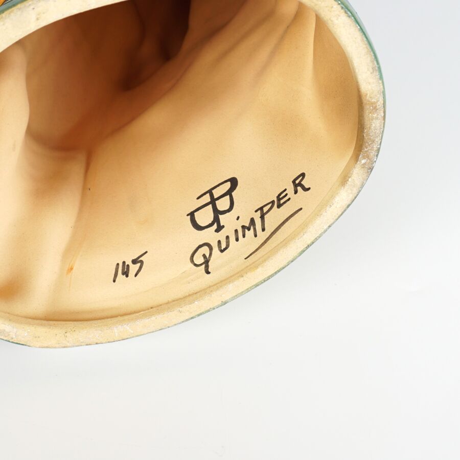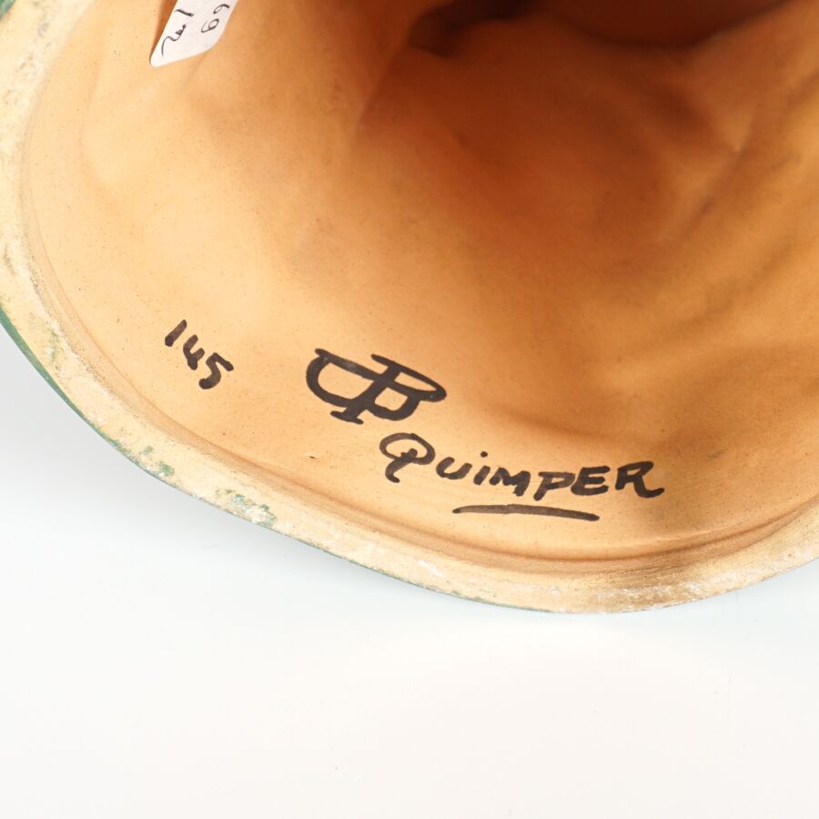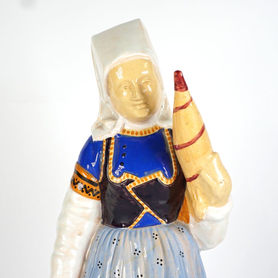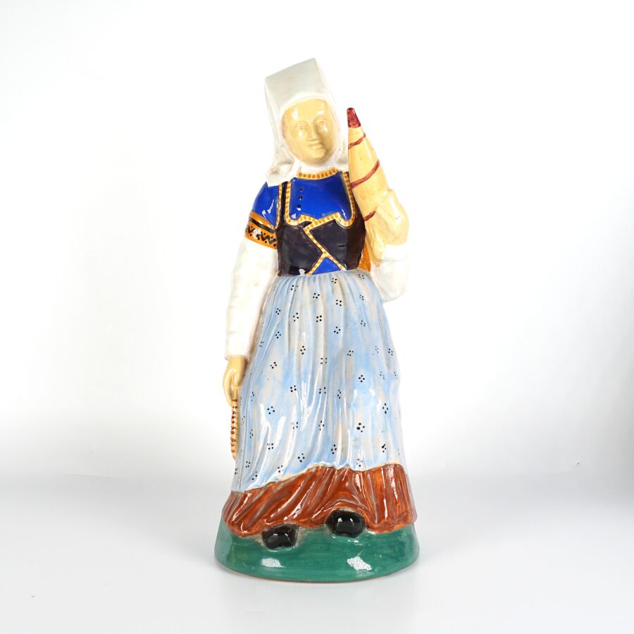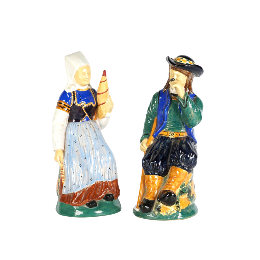 HENRIOT - QUIMPER : "Couple de quimperlois - femme à la quenouille et homme à la pipe", paire de sujets en faïence émaillée polychrome, signée et numérotée 45 dessous, circa 1930, H. 32 cm.