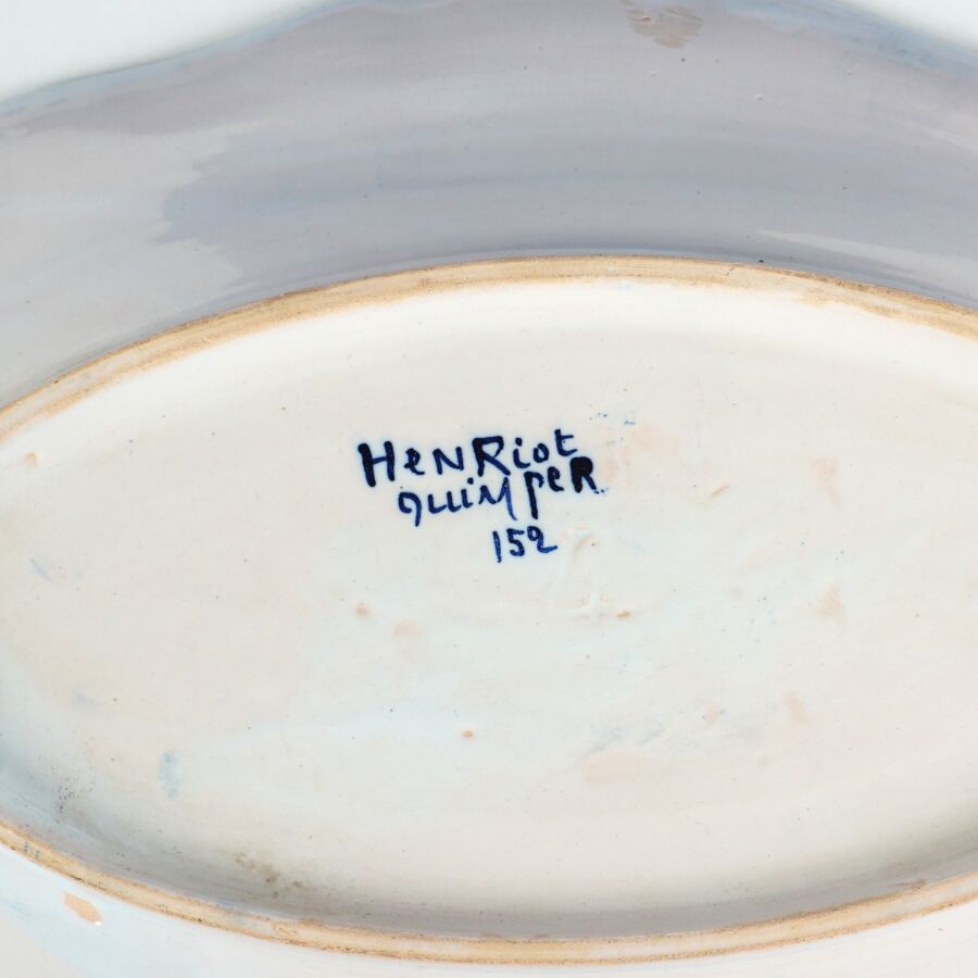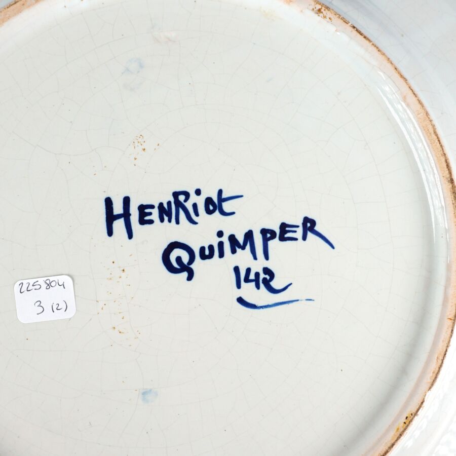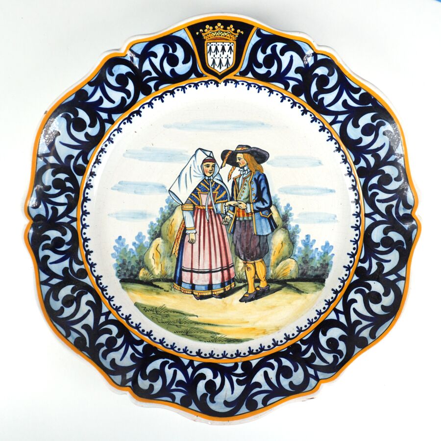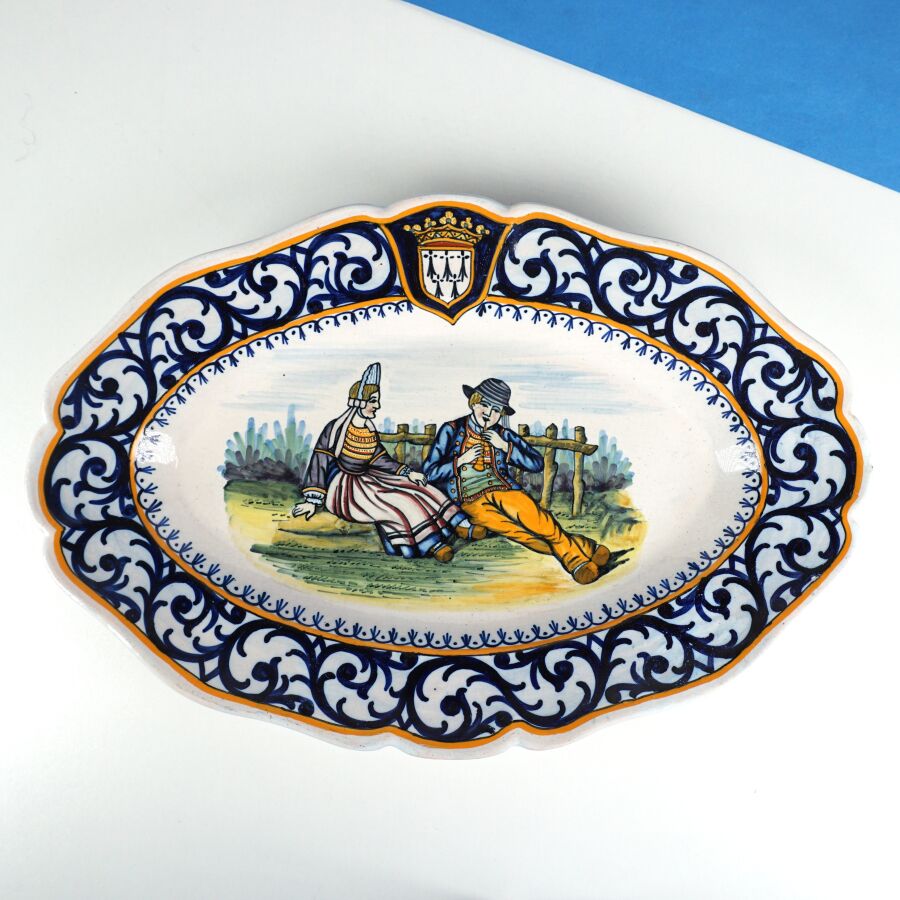 HENRIOT QUIMPER : Deux plats en faïence émaillée polychrome, l'un rond à décor d'un couple de bretons, le second ovale à décor d'un joueur de bombarde et une bretonne, signés dessous, D. 34 cm. L. 38 cm (petits éclats).