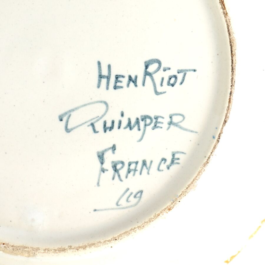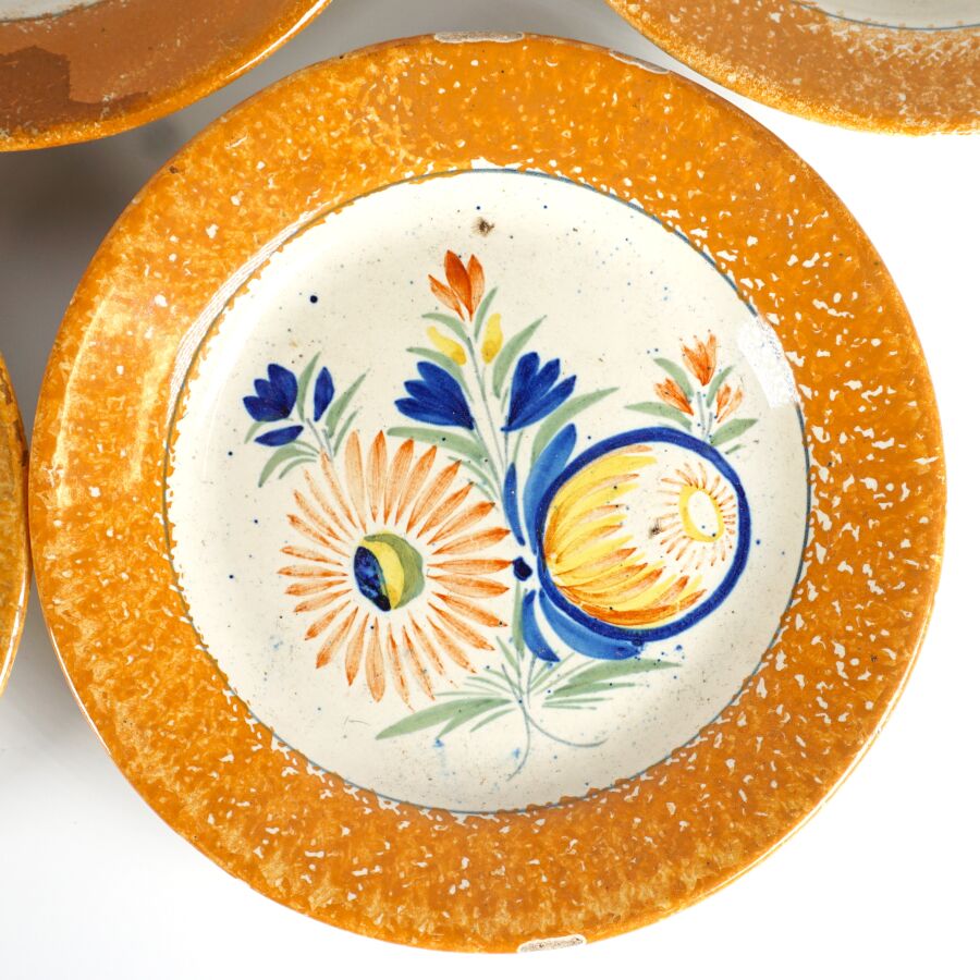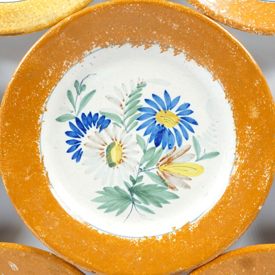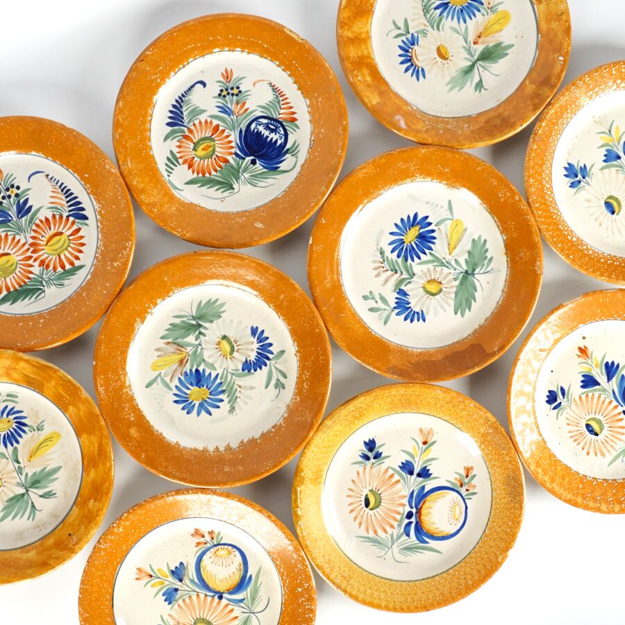 HENRIOT - QUIMPER : Dix assiettes à dessert en faïence émaillée polychrome à décor varié de bouquets de fleurs dans le bassin, bordure à l'éponge de couleur ocre, marqués dessous, circa 1920, D. 17 cm (légers défauts de cuisson en bordure, quelques éclats).