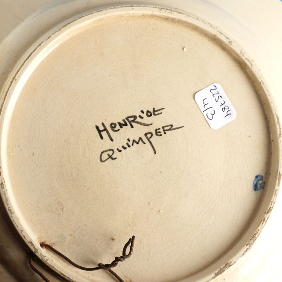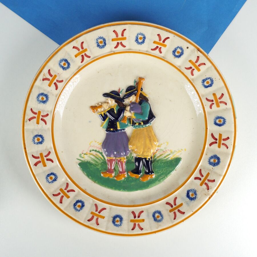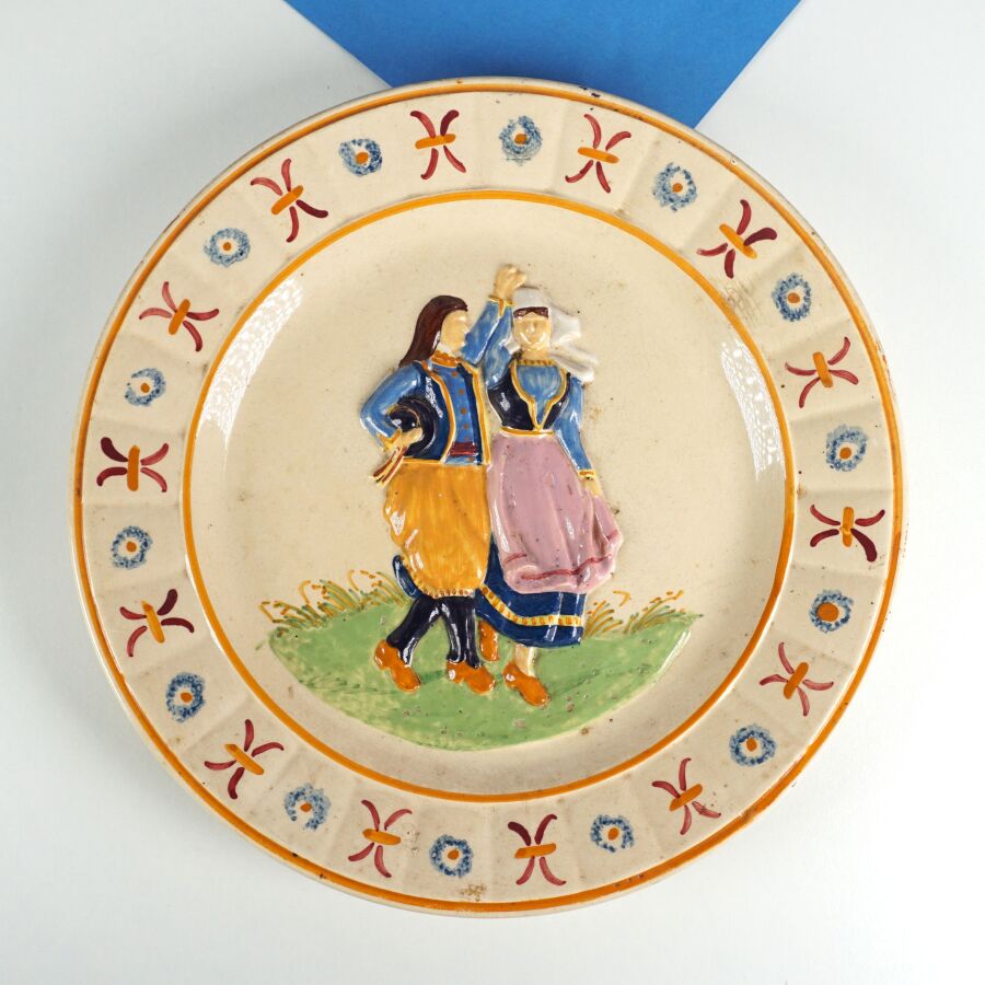 HENRIOT - QUIMPER : Paire d'assiettes en faïence émaillée polychrome traitée en léger bas-relief à décor de deux sonneurs et d'un couple de quimpérois en danse, circa 1930, D. 25 cm.