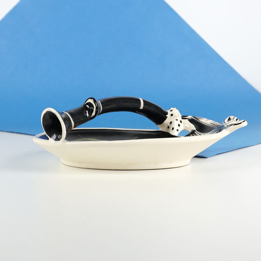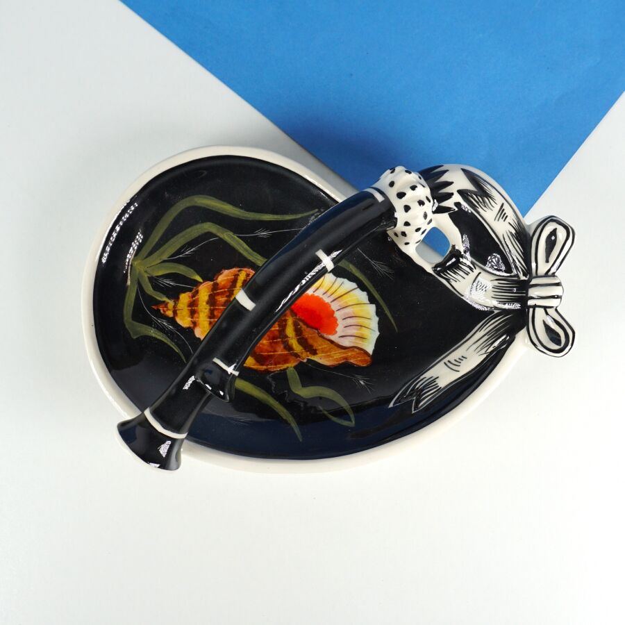 On joint HENRIOT - QUIMPER : Ravier en faïence émaillée polychrome à décor de conque, circa 1950, L. 23 cm.