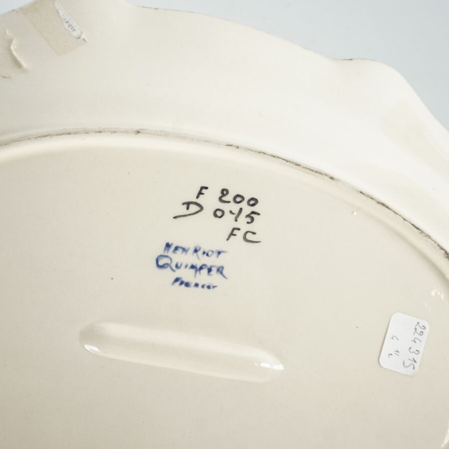 HENRIOT QUIMPER : Soupière et son plateau en faïence émaillée polychrome à décor de danses bretonnes et genêts, travail moderne, Dim. Plateau : 39 x 28 cm. Dim. Soupière : 38 x 22 cm.