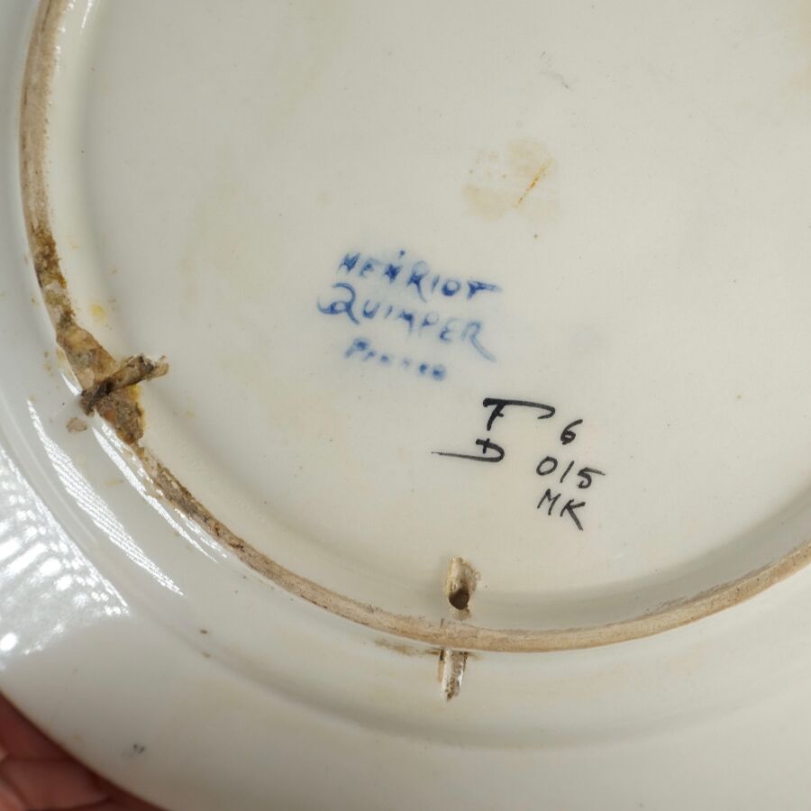 HENRIOT QUIMPER : Suite de trois assiettes en faïence émaillée polychrome à décor de danseurs, marquées au revers, D. 25 cm environ.