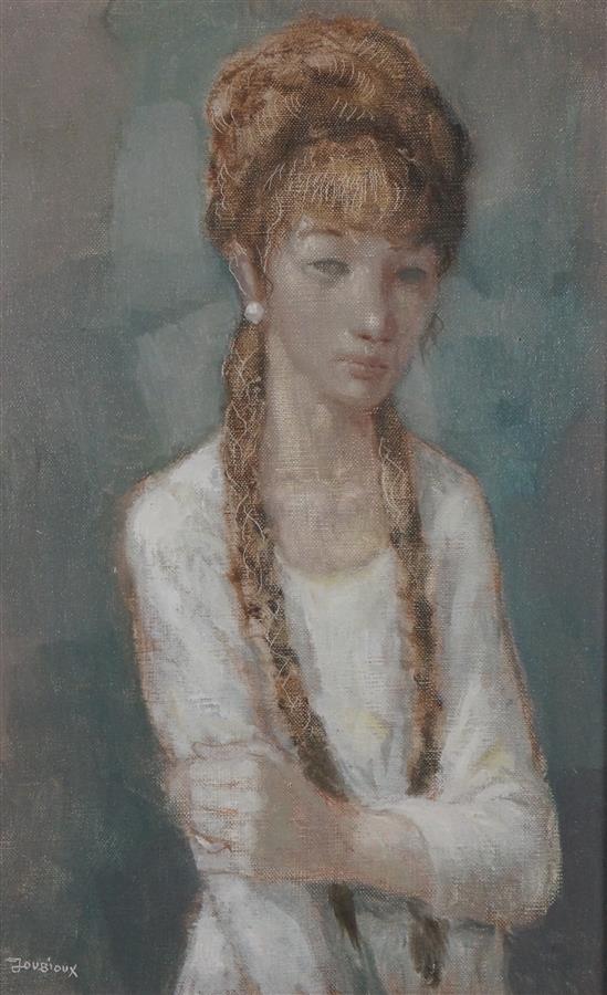 Henry JOUBIOUX (1924-1986), "Jeune fille aux nattes et à la perle", huile sur toile, signée en bas à gauche, contresignée au dos, 41 x 27 cm.