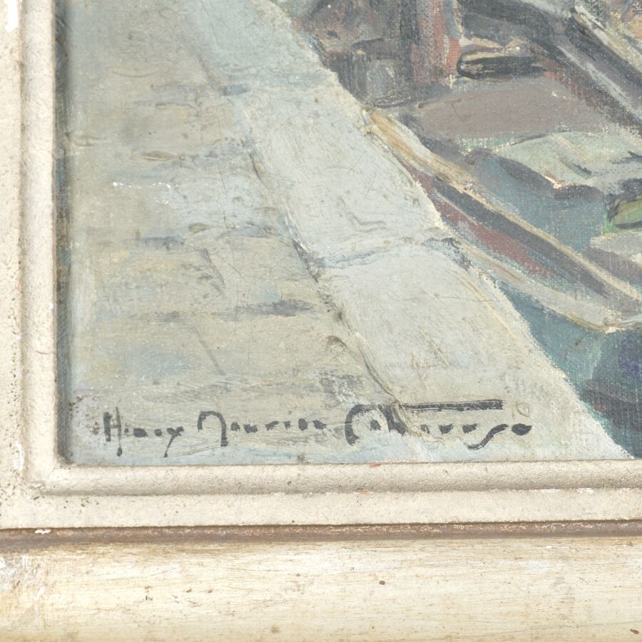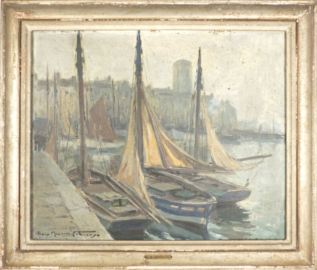 Henry Maurice CAHOURS (1889-1974), "Scène de port sur l'Atlantique", huile sur toile signée en bas à gauche, 38 x 46 cm (petit enfoncement en haut à droite, tâches, quelques manques en partie supérieure).