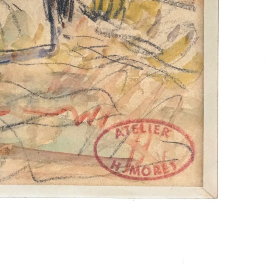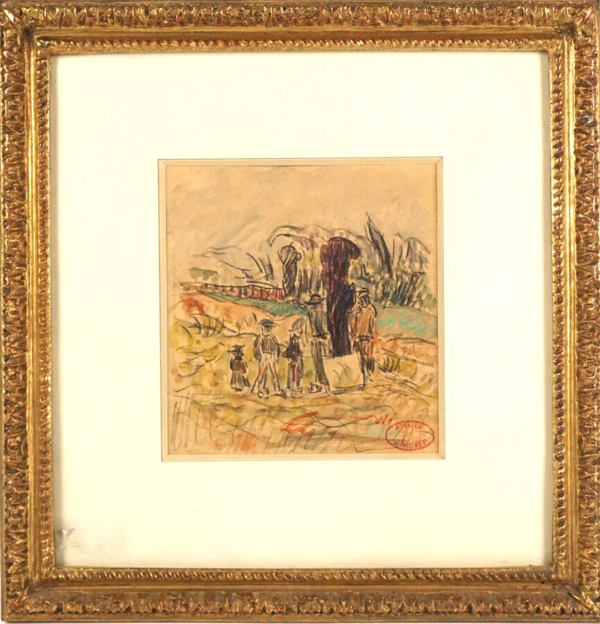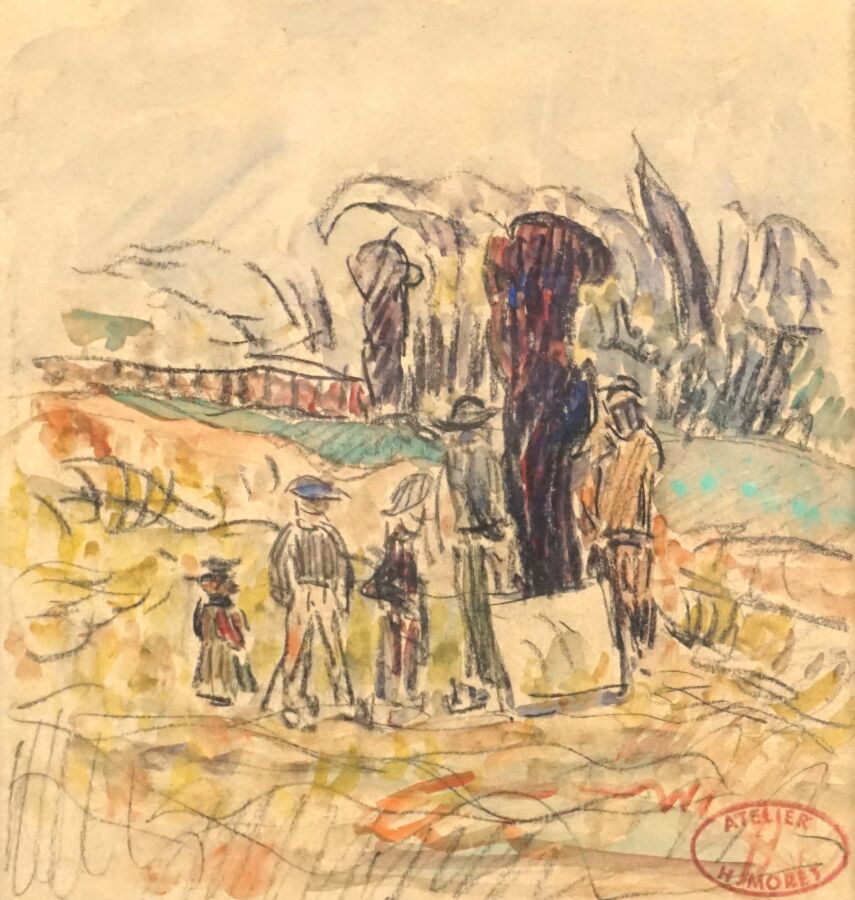 Henry MORET (1856-1913), "Personnages devant un paysage vallonné", aquarelle signée du cachet de l'artiste en bas à droite, 16.1 x 15.1 cm.