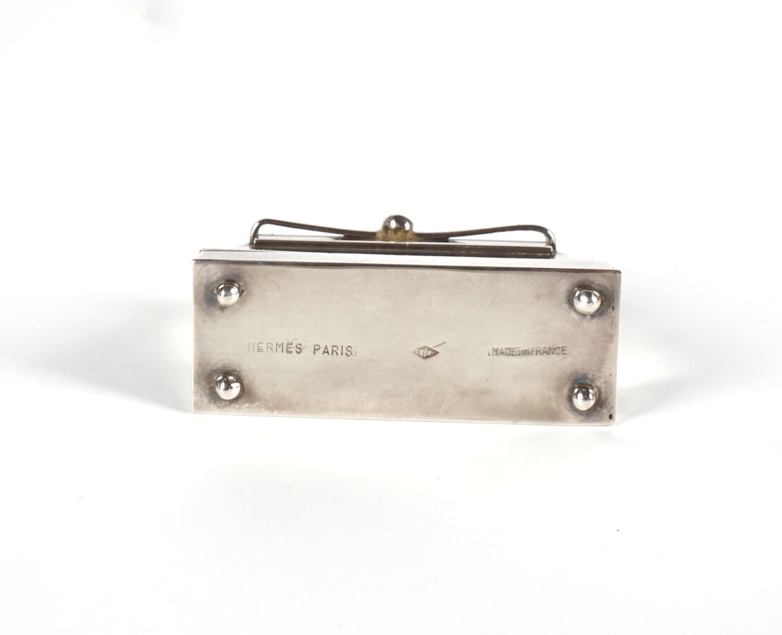 HERMES : Boîte à pilules "Sac Kelly" en argent, poinçon Minerve, signée au-dessous, L. 4.5 cm, H. 4.5 cm. Poids brut : 40.6 g environ.