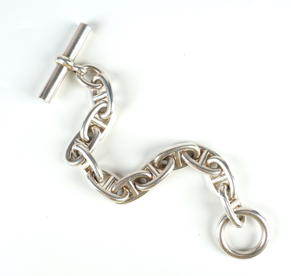 HERMES : Bracelet "Chaîne d'ancre" en argent (925/oo), très grand modèle, Dim. d'un maillon : 23 x 14 mm, fermoir toggle, signé, L. 22 cm. Poids brut : 105.4 g environ (quelques traces d'usage).