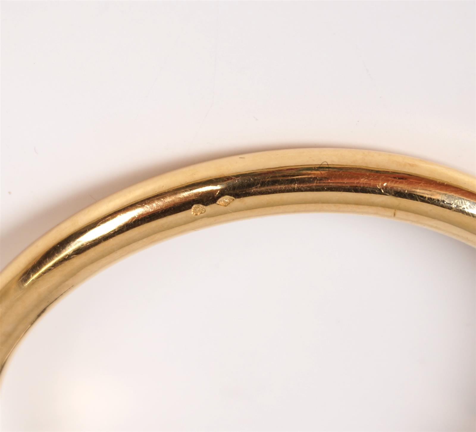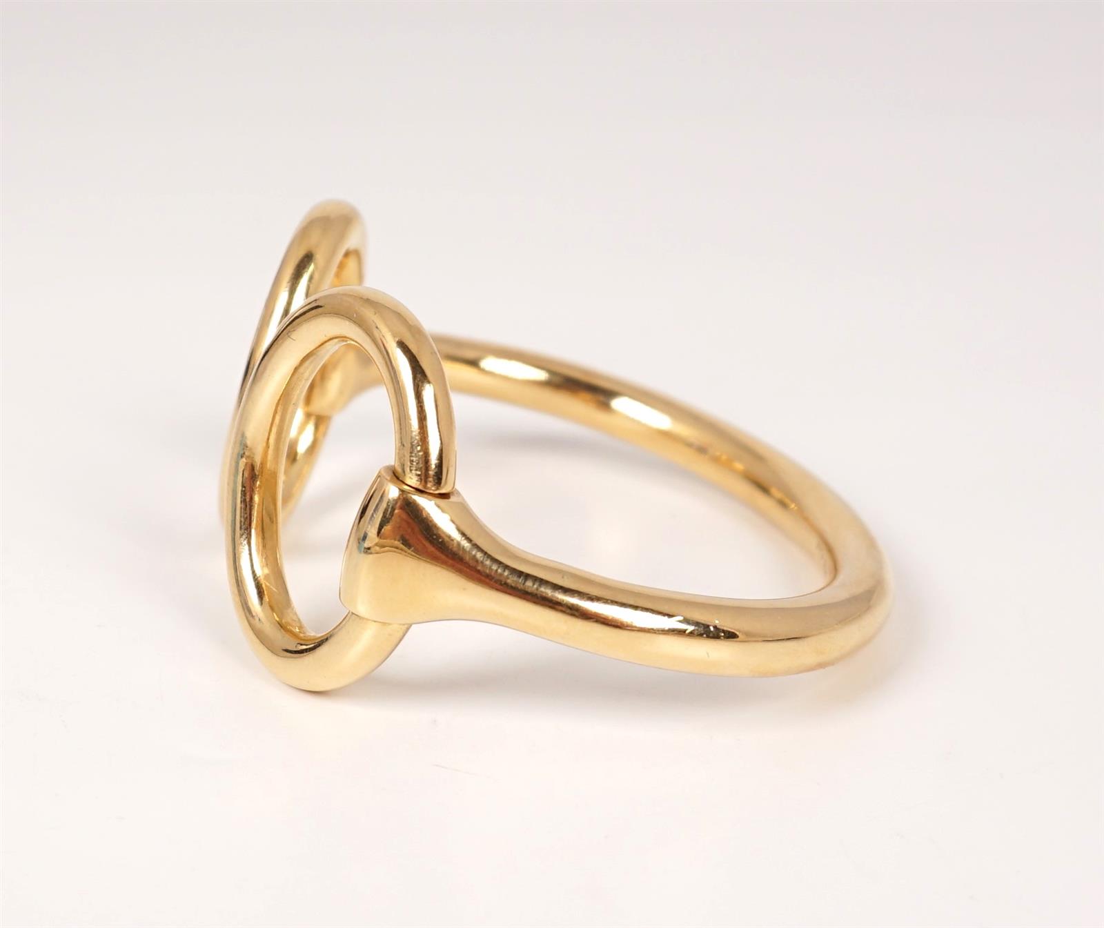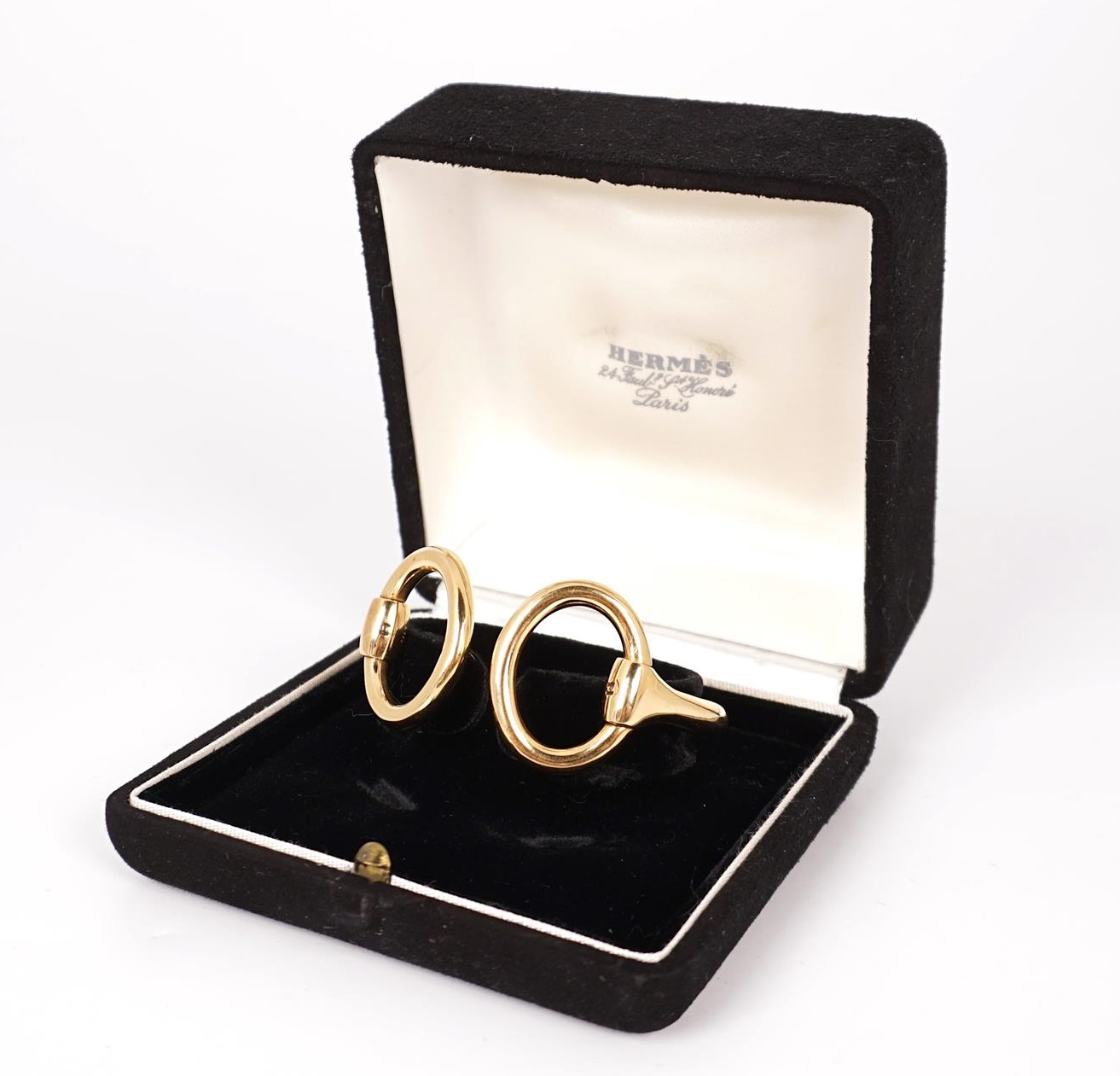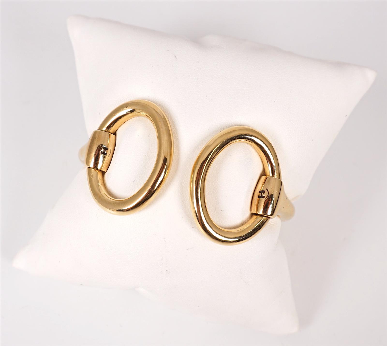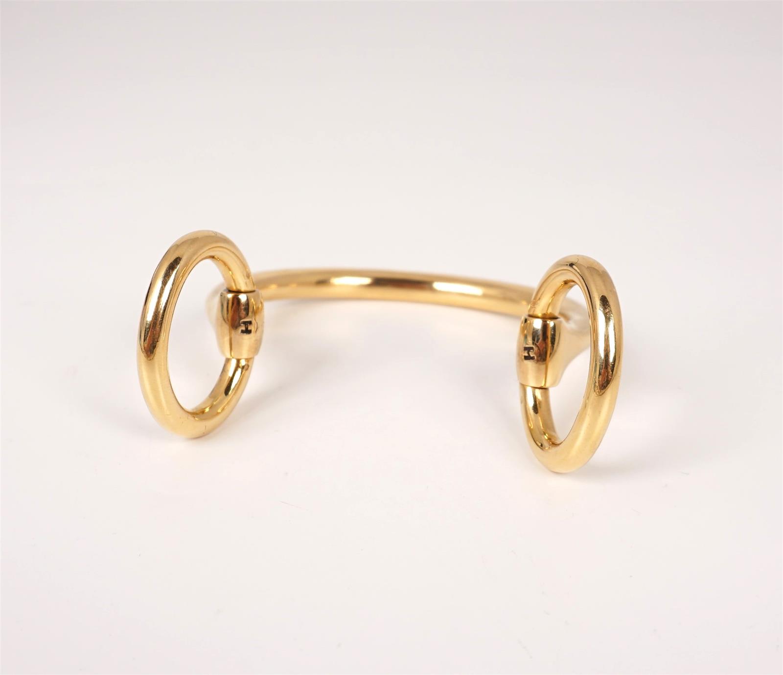 HERMES : Bracelet semi-rigide "Mors" en or jaune 18 K (750/oo), les 2 anneaux mobiles ornés chacun d'un "H" gravé, signé "Hermès Paris", présenté dans son coffret noir d'origine signé. Poids brut : 99 g environ (légères traces d'usage).