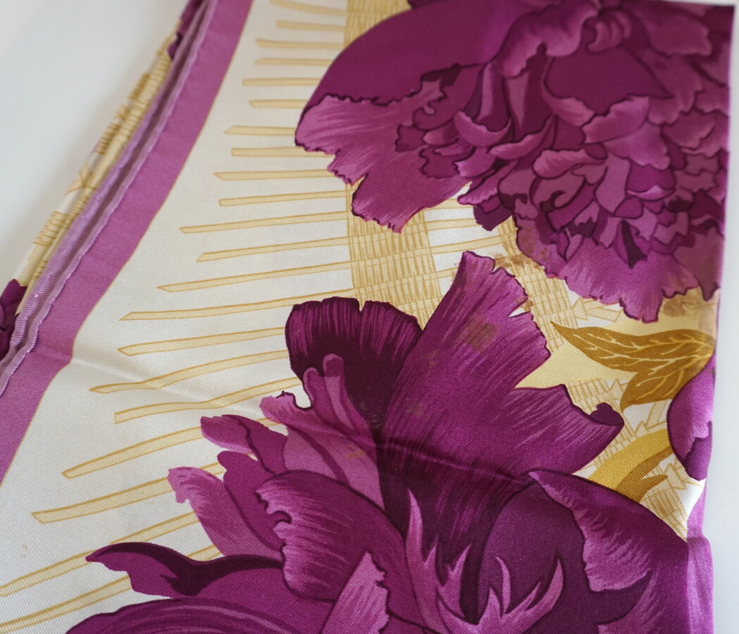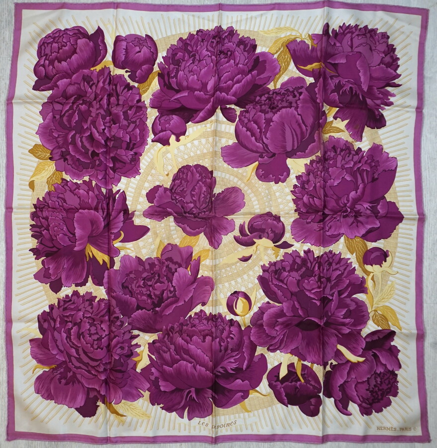 HERMES : Carré de soie imprimé "Les Pivoines", représentant fleurs épanouies et boutons pourpres sur fond de cannage jaune, marge pourpre rose, signé et titré, modèle créé par Christiane Vauzelle en 1978, 90 x 90 cm environ (usagé, taches, quelques fils tirés, un coin légèrement décousu).