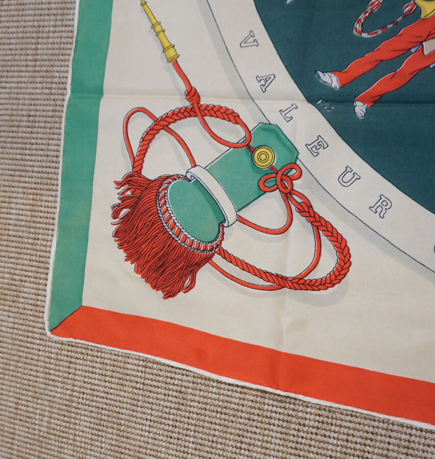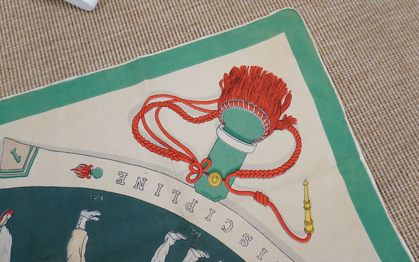 HERMES : Carré de soie imprimé, titré "A la Gloire de la Légion Etrangère", fond vert et ivoire, marge rouge et verte, modèle créé par H. Grygkar en 1951, réédité en 1963, signé, 90 x 90 cm environ (taches, usures, fils tirés).