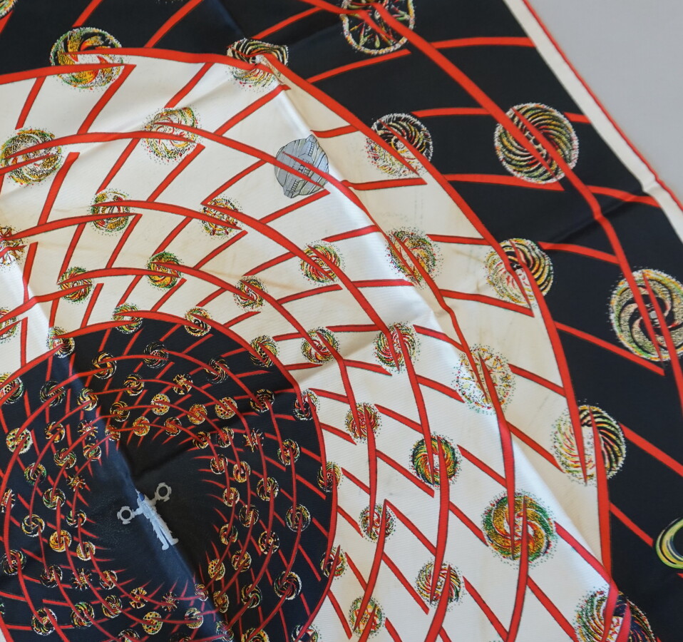 HERMES : Carré de soie imprimé titré "Les feux de l'espace", fond noir et ivoire, signé, 90 x 90 cm environ (en l'état, taches).