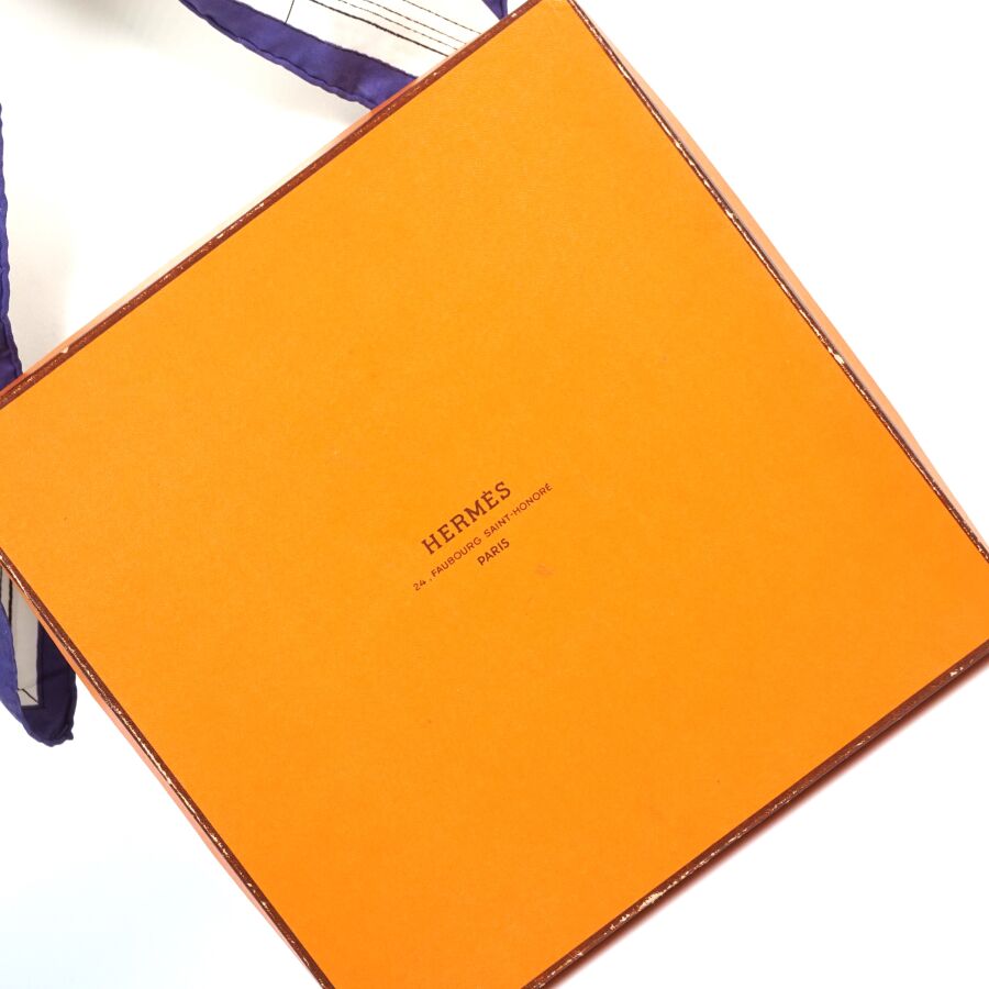 HERMES : Carré de soie imprimé, titré "Quai aux fleurs", fond ivoire, marge bleu violine, signé, modèle créé par Hugo Grygkar en 1952, réédité en 1990 et 2000, présenté avec sa boîte d'origine, 90 x 90 cm environ (quelques traces).