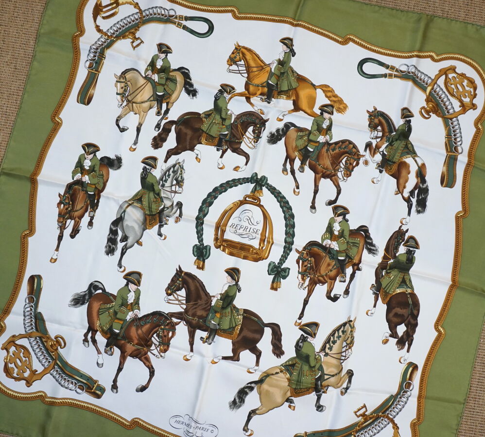 HERMES : Carré de soie imprimé, titré "Reprise", fond blanc, marge verte, modèle créé par Philippe Ledoux, signé, 90 x 90 cm environ (petites traces et fils tirés).