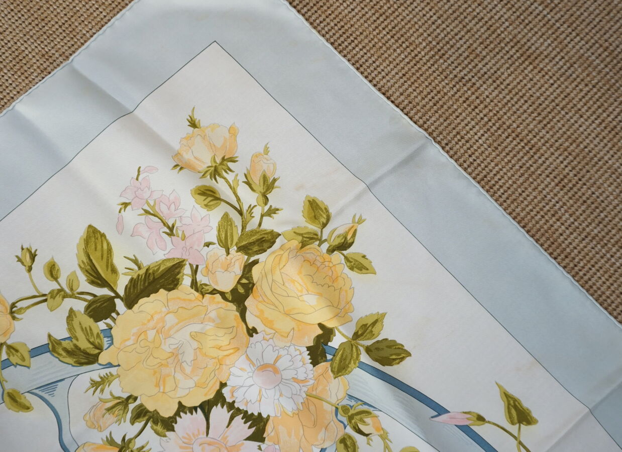 HERMES : Carré de soie imprimé, titré "Romantique", fond écru, marge bleu ciel, 90 x 90 cm environ (taches et fils tirés).